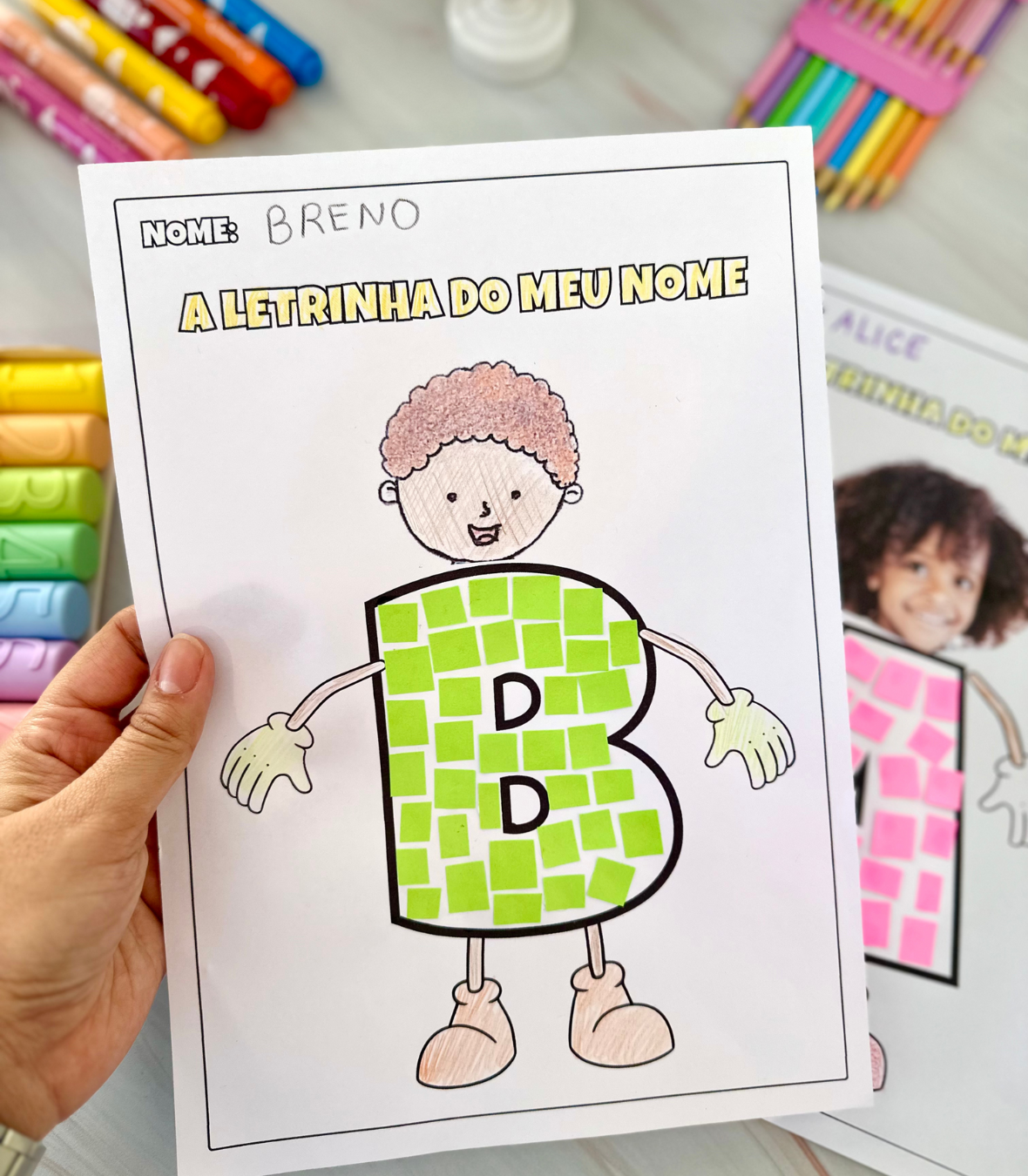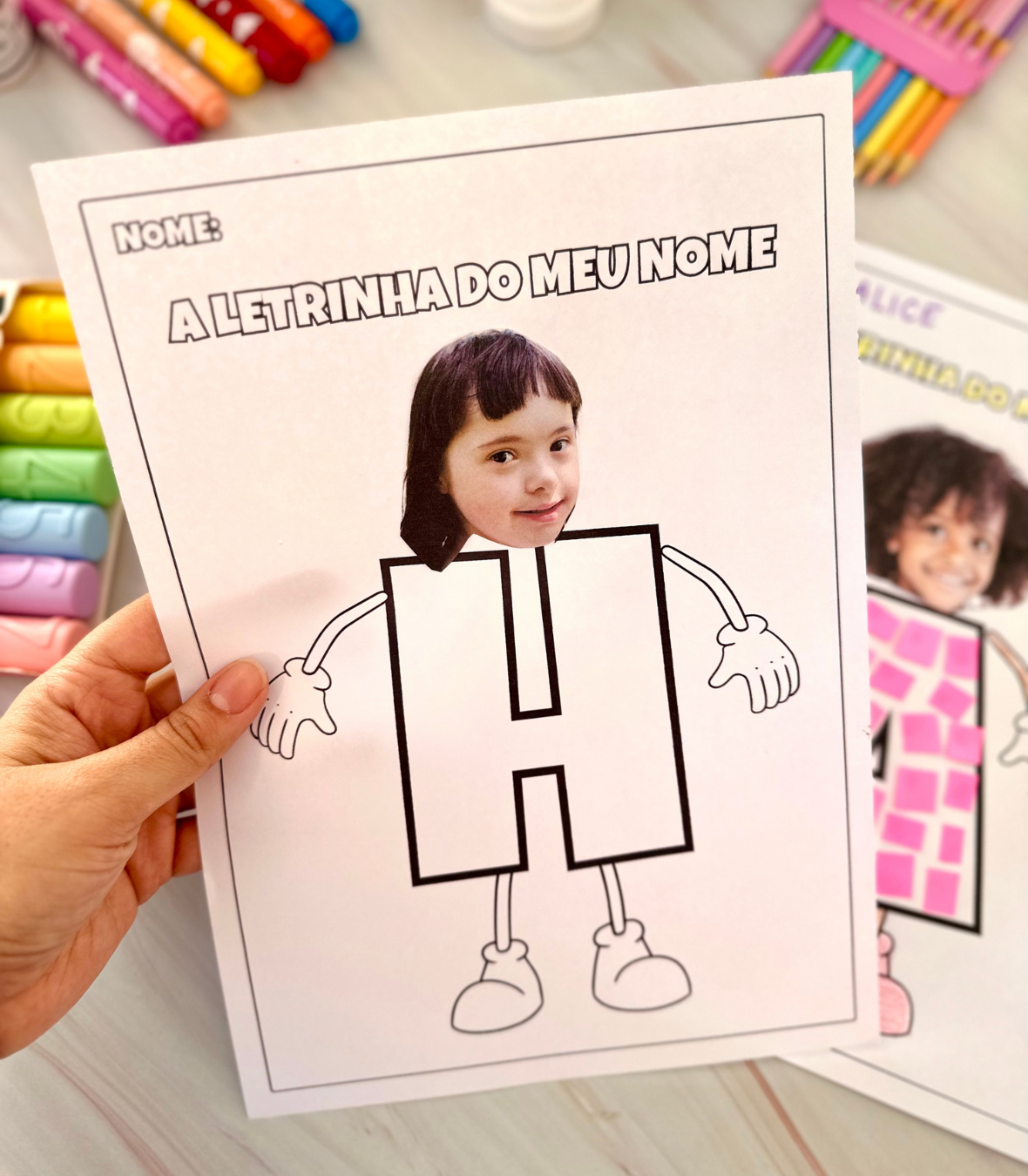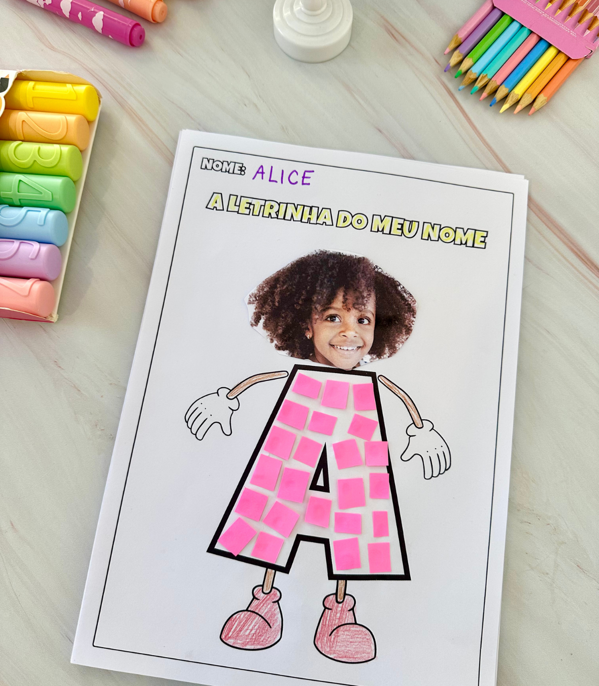 Para realizar a atividade será necessário imprimir uma foto do rosto da criança, ou pedir para ela fazer o desenho. E para preencher a letra podemos utilizar papel colorido, tinta, barbante