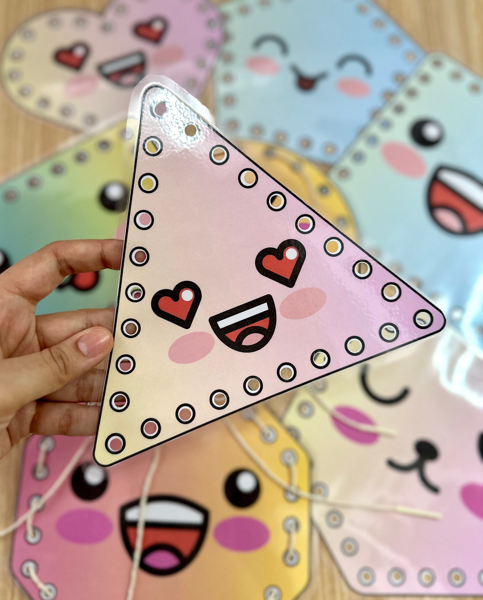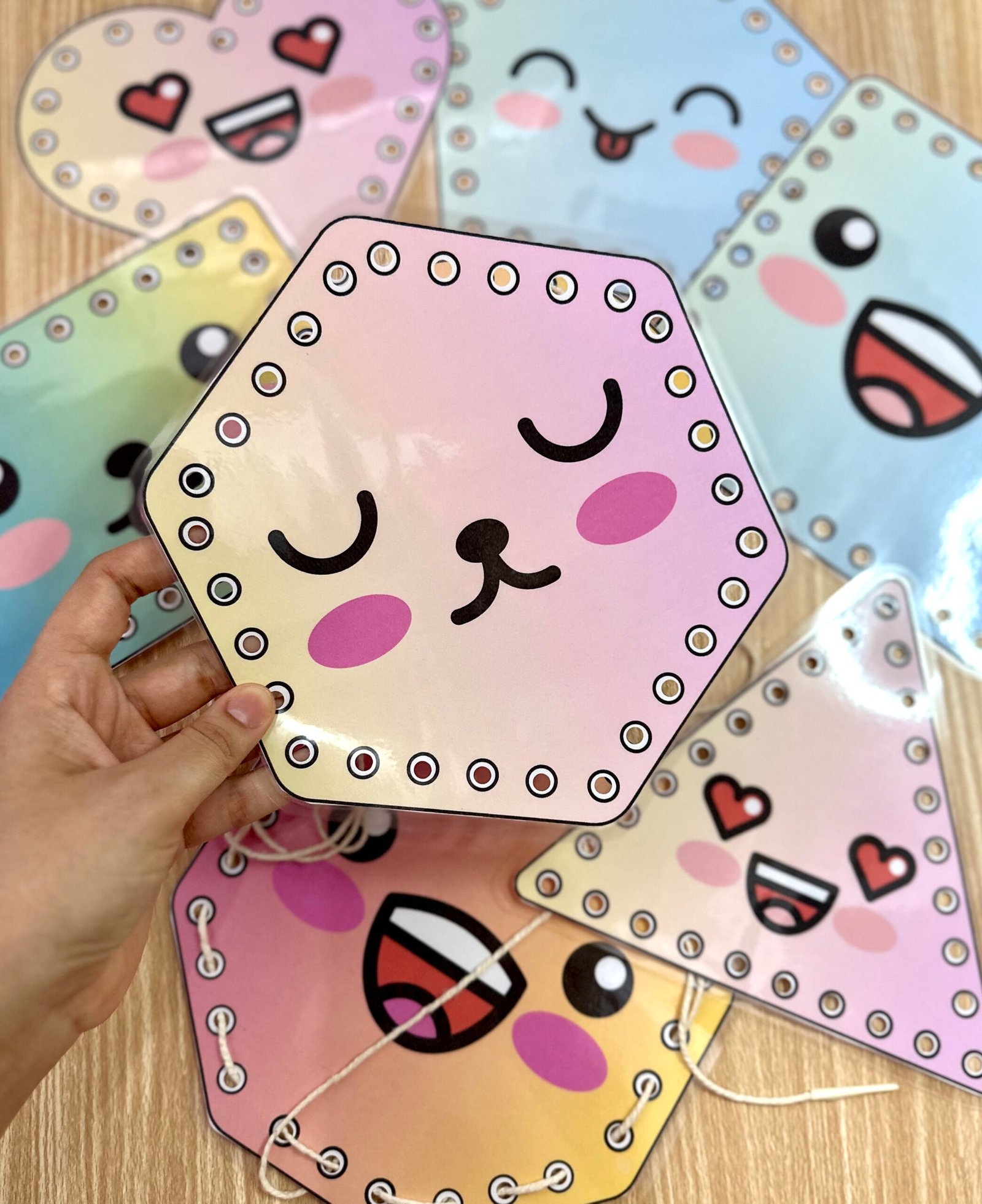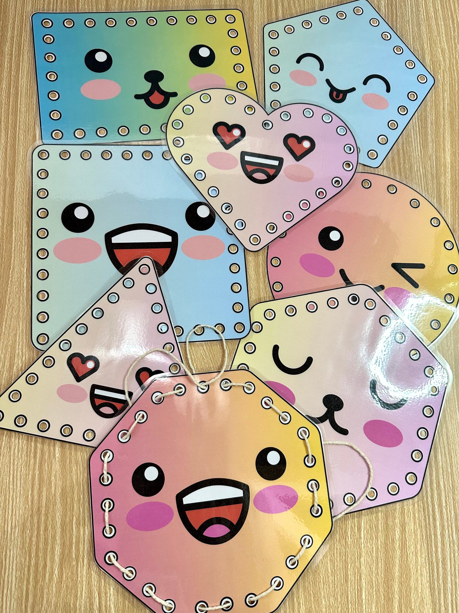 O arquivo Alinhavos Formas Geométricas inclui 8 placas de formasdiferentes, todas em tamanho A4. As formas estão com todos os cantos arredondados, para evitar o risco de possíveis acidentes. Para autilização das placas é necessário imprimir o material em folha sulfite comum, recortar as placas e plastificar.