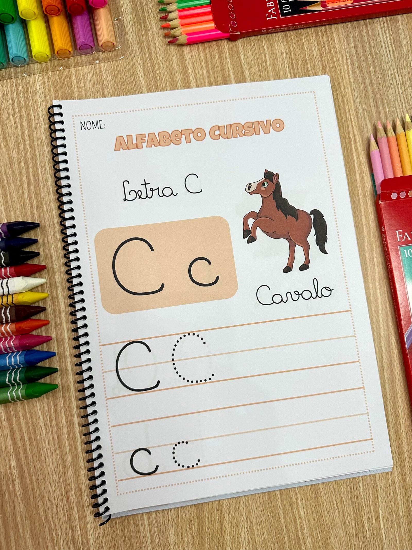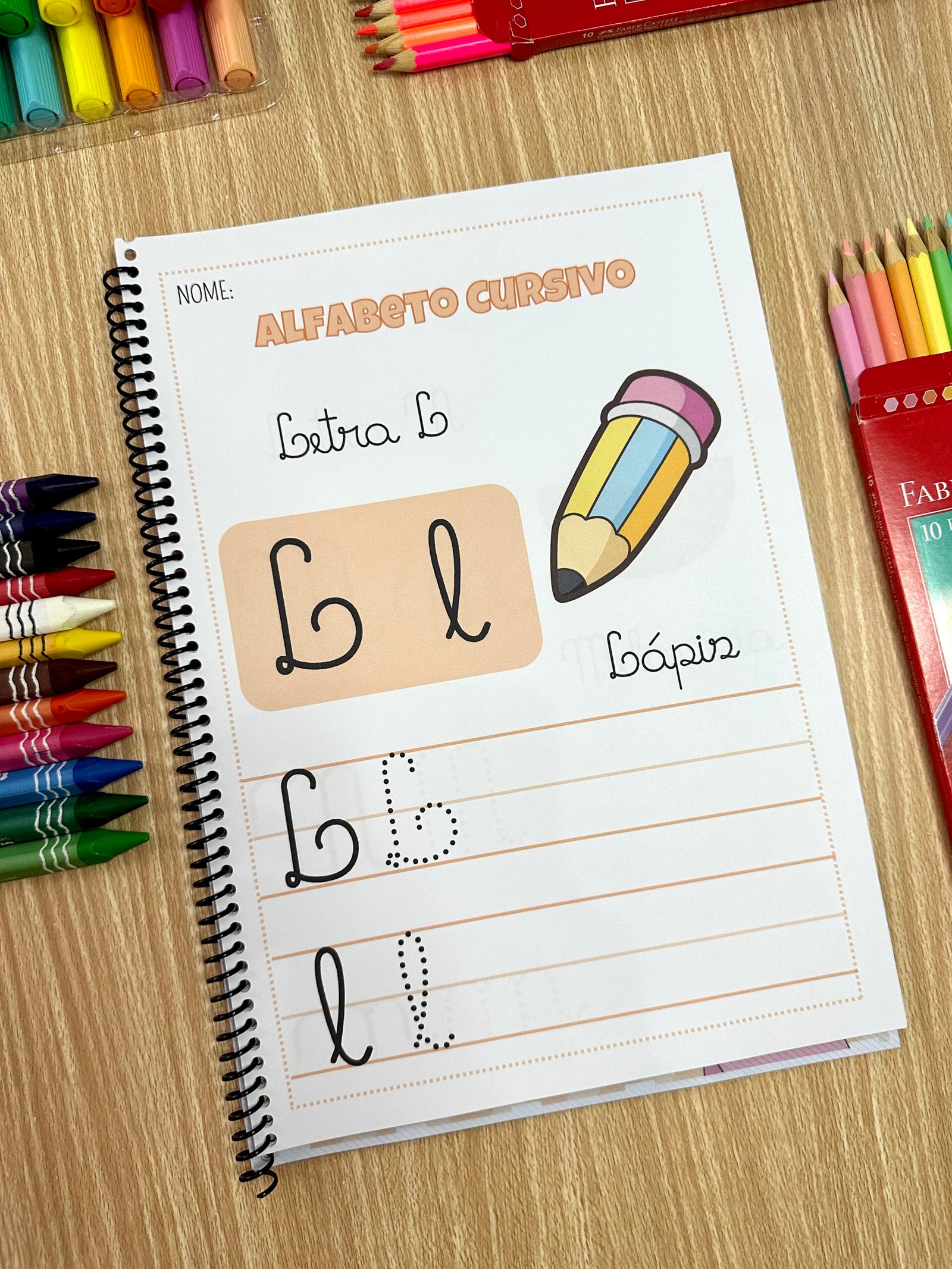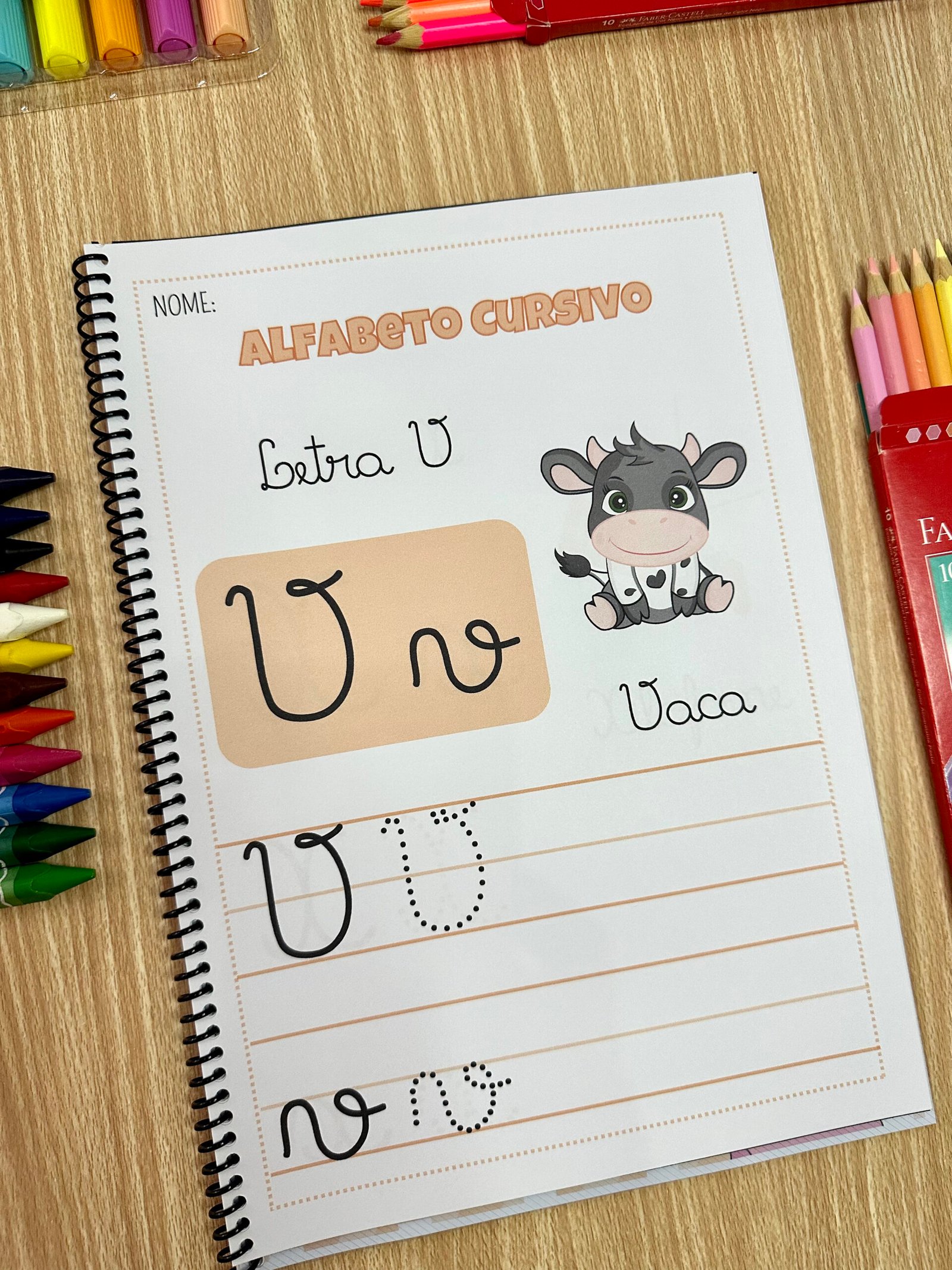 As atividades trabalham o traçado da letra cursiva, auxiliam no desenvolvimento da coordenação motora fina e reconhecimento das letras em formato cursivo.