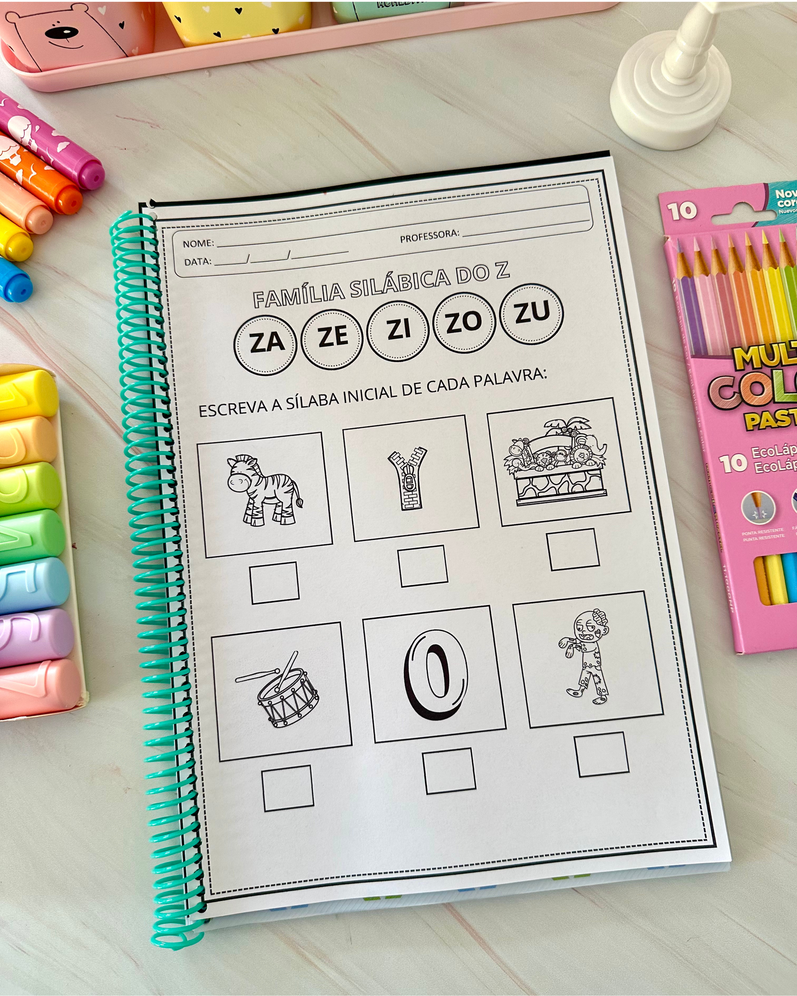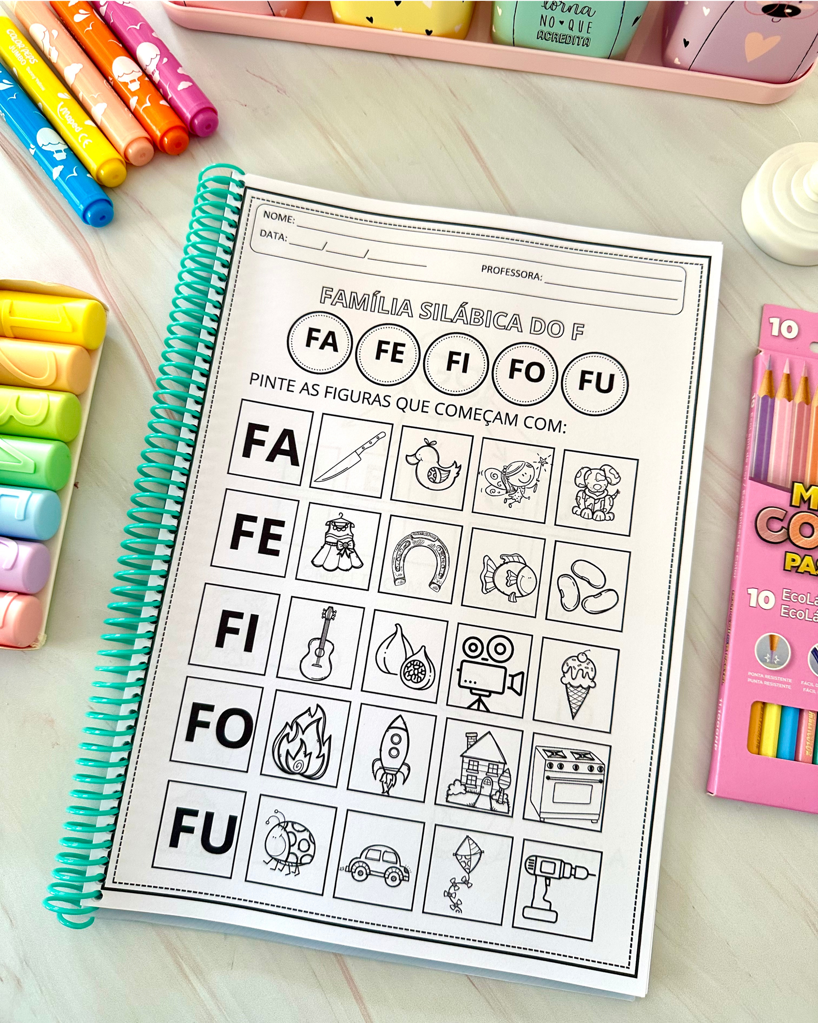 O arquivo vai em PDF pronto para impressão, inclui atividades variadas com todas as famílias silábicas simples. As atividades são para colorir.