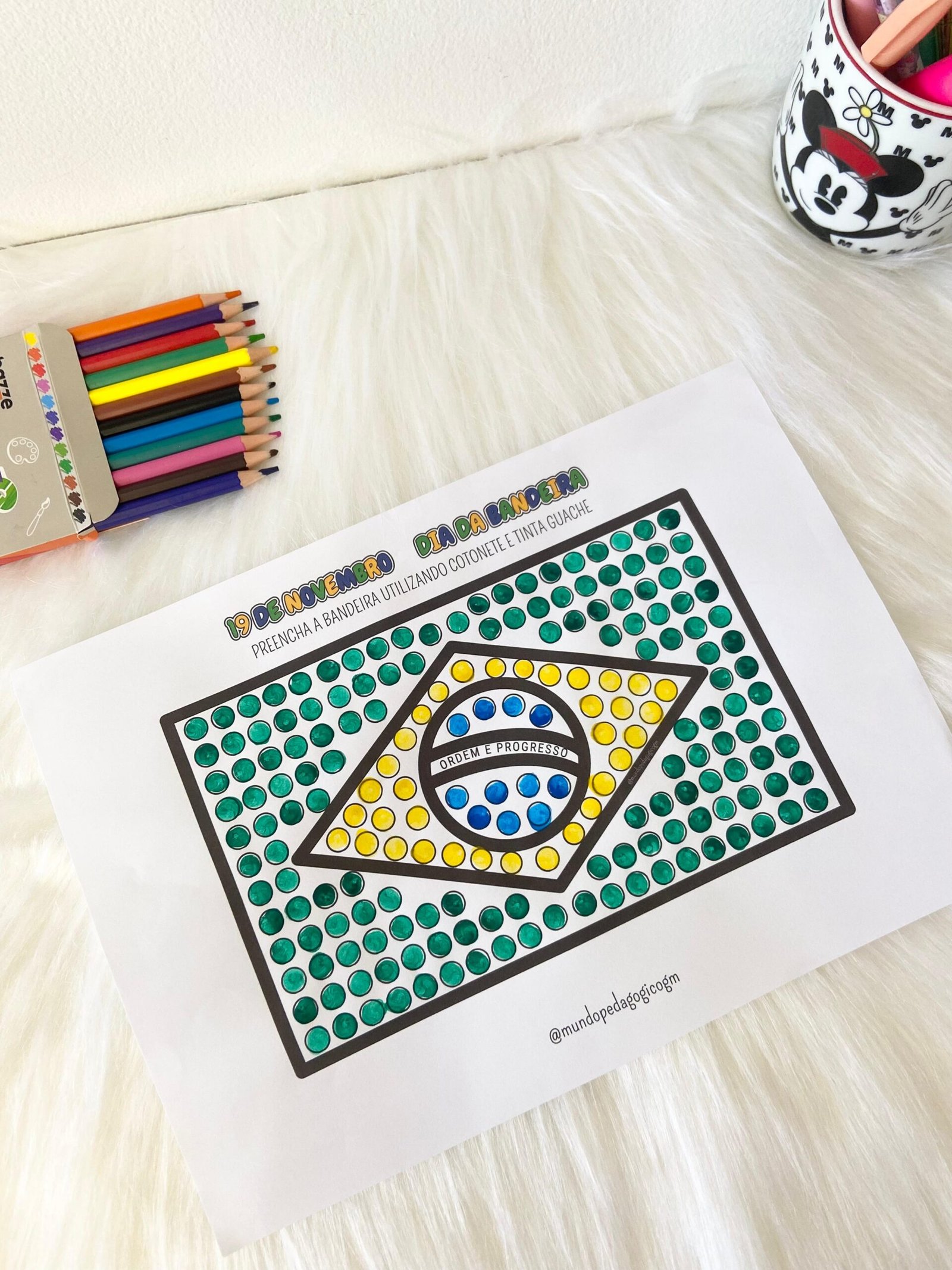 O arquivo lindo para trabalhar o Dia da Bandeira com as crianças da Educação Infantil, para a criança colorir com o auxílio do cotonete e tinta guache.