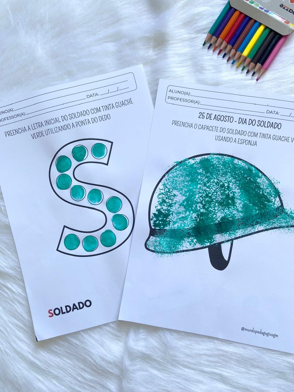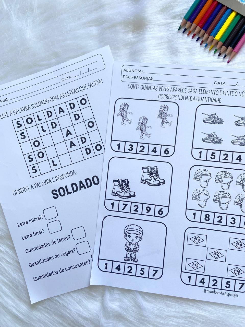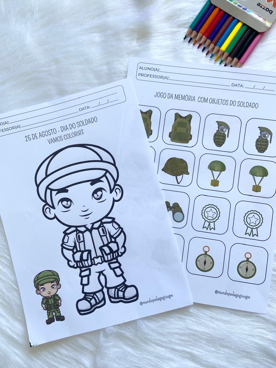São 9 páginas de atividades com o tema Dia do Soldado, para trabalhar com crianças da Educação Infantil e Alfabetização. Possui conceitos de artes, numerais, percepção visual, concentração e muito mais.