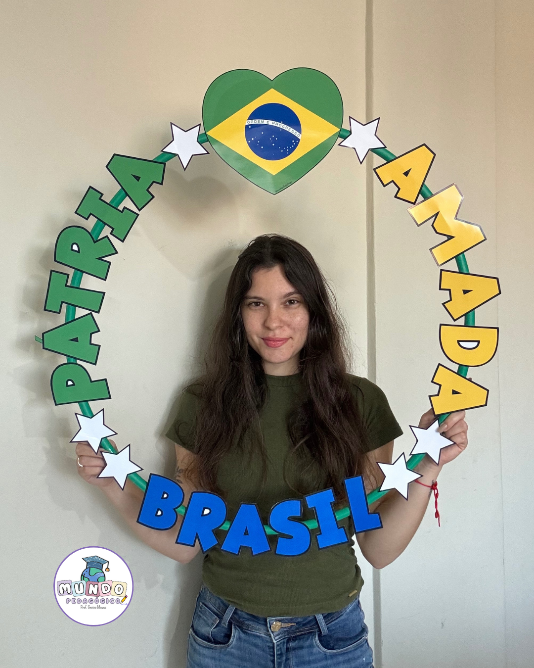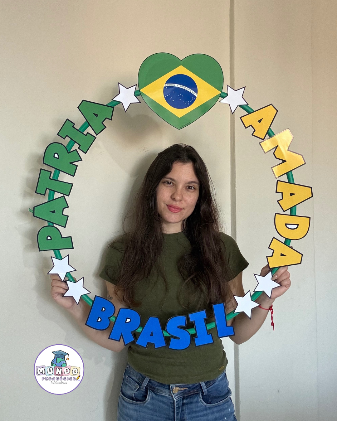 Com design colorido e vibrante, ela traz a frase “Pátria Amada Brasil”, estrelas decorativas e um coração com a bandeira nacional, perfeita para celebrar esse momento cívico com muita alegria e patriotismo.