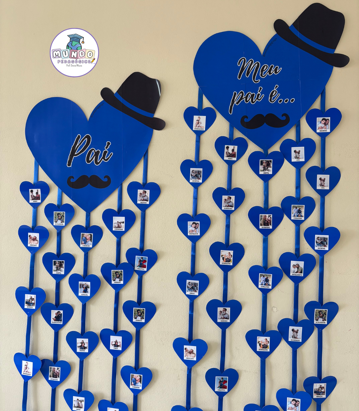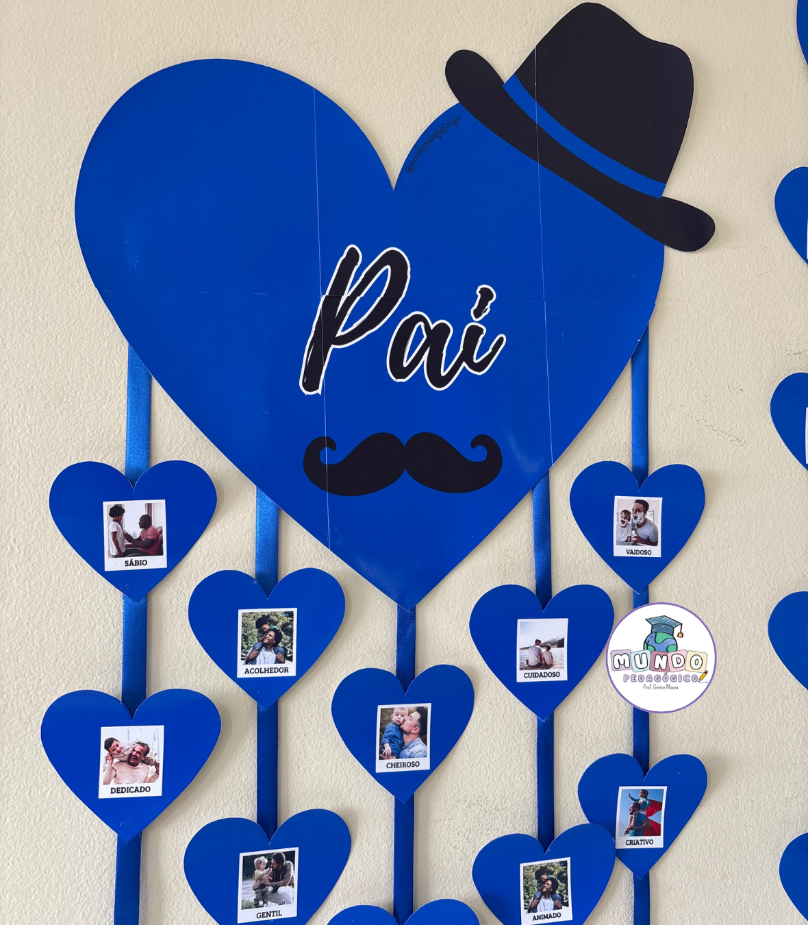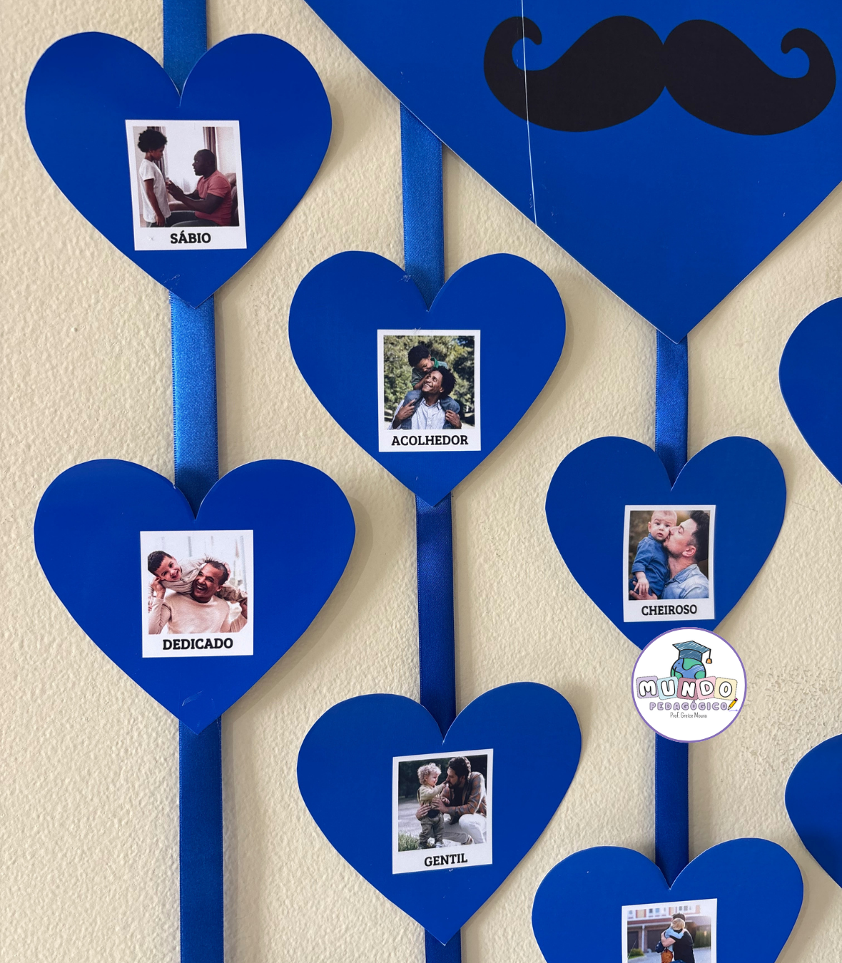 Este material foi pensado especialmente para o Dia dos Pais e é perfeito para decorar salas de aula e murais escolares. Cada coração pode ser preenchido com uma foto do(a) aluno(a) com seu pai e uma legenda com um adjetivo carinhoso, descrevendo o que ela representa para seu filho ou filha. 🥰