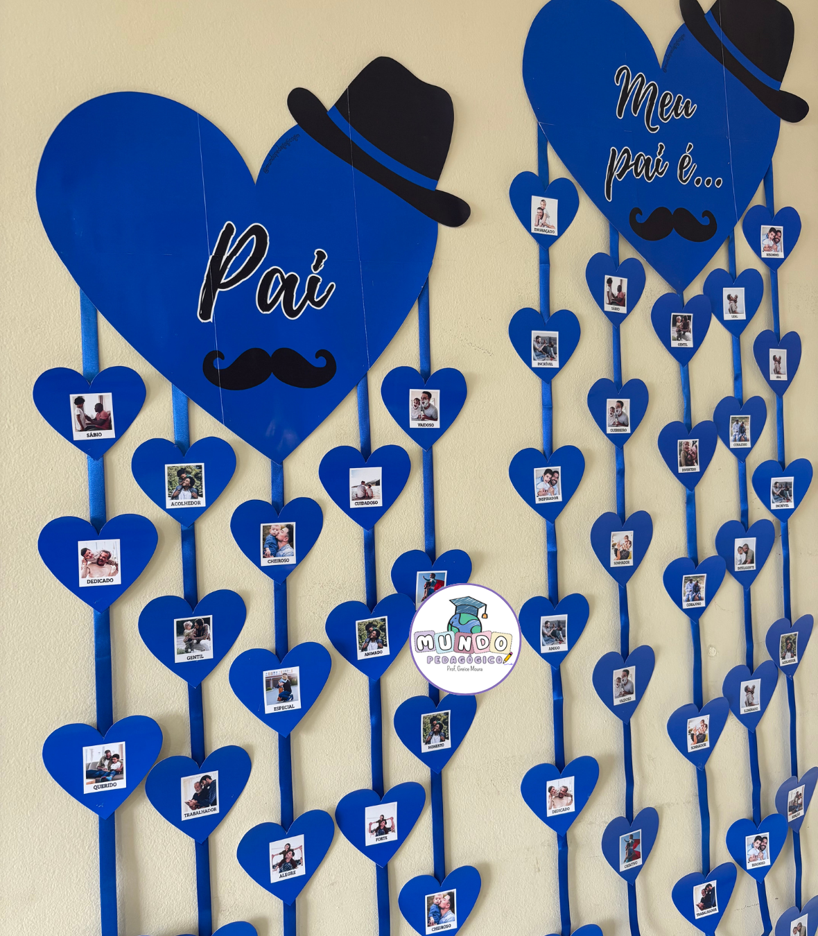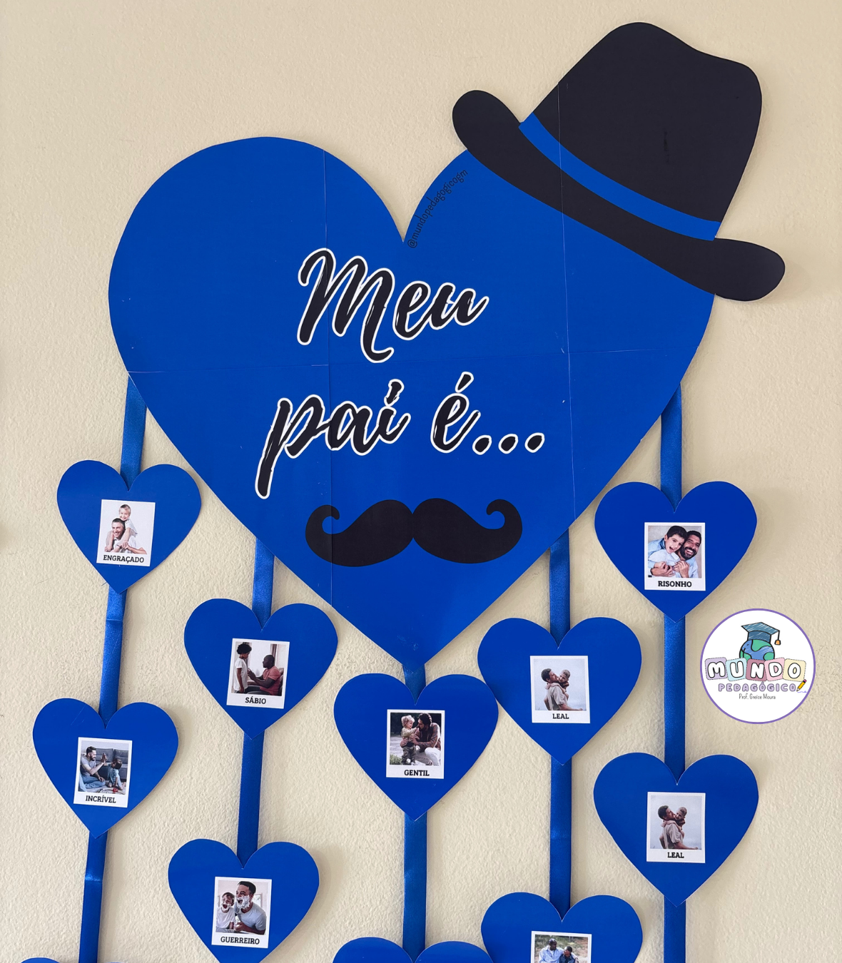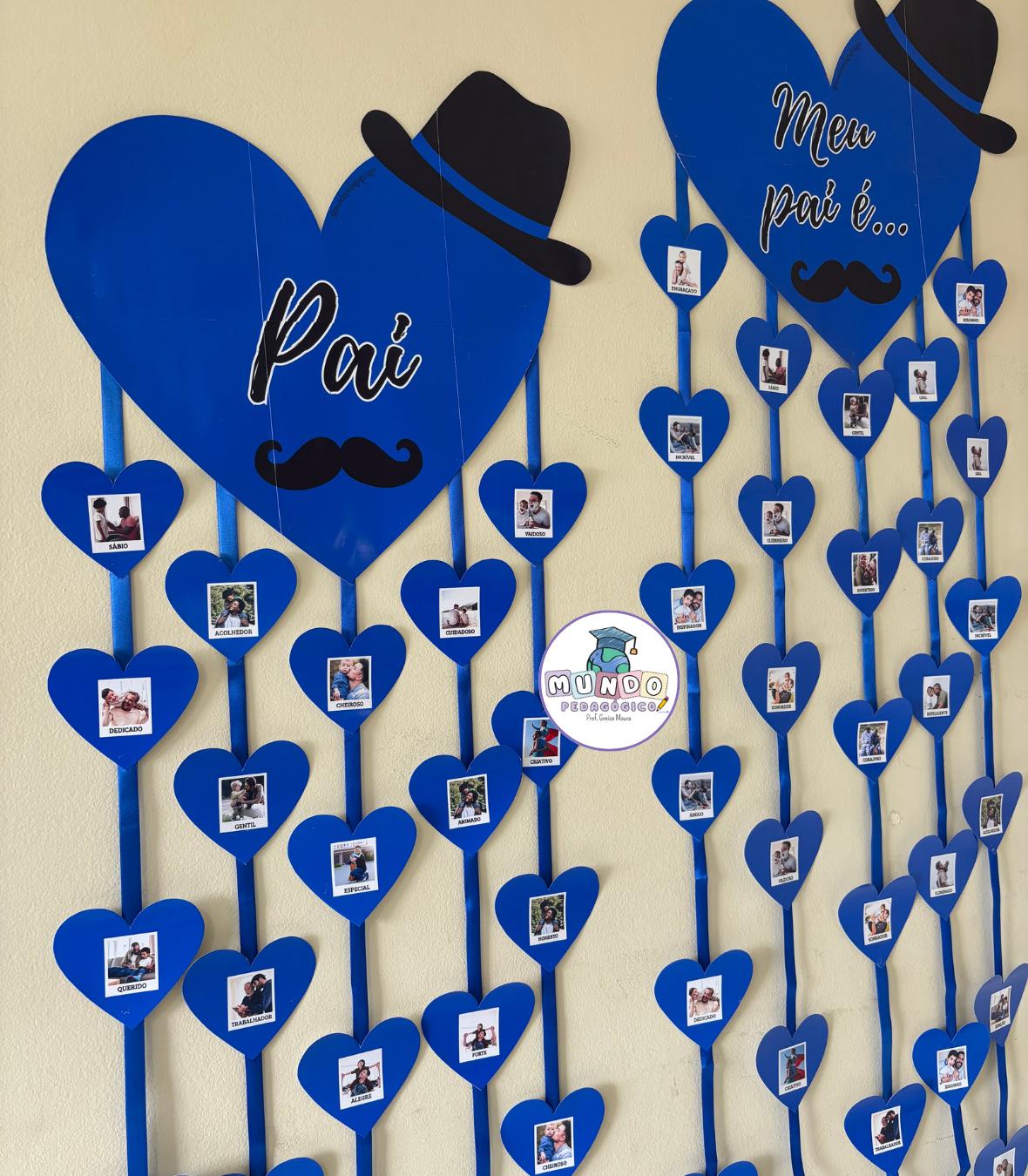 Este material foi pensado especialmente para o Dia dos Pais e é perfeito para decorar salas de aula e murais escolares. Cada coração pode ser preenchido com uma foto do(a) aluno(a) com seu pai e uma legenda com um adjetivo carinhoso, descrevendo o que ela representa para seu filho ou filha. 🥰