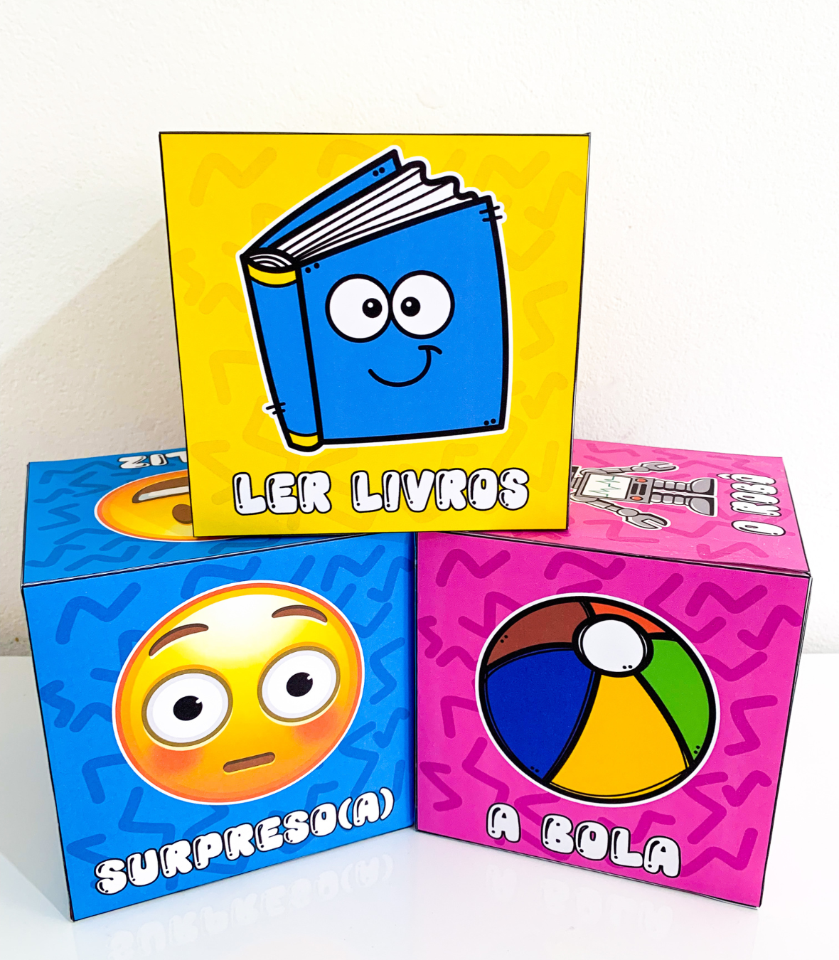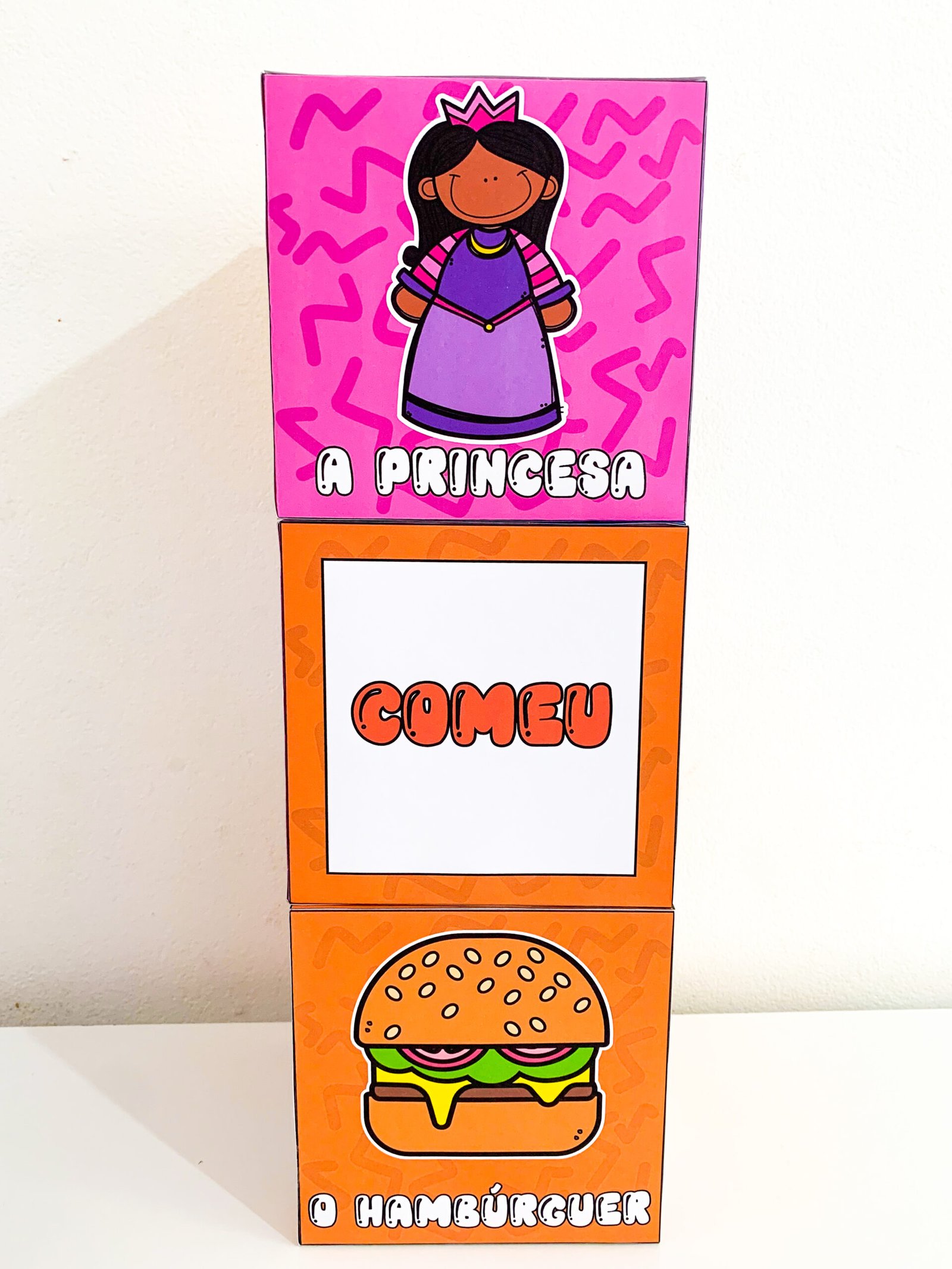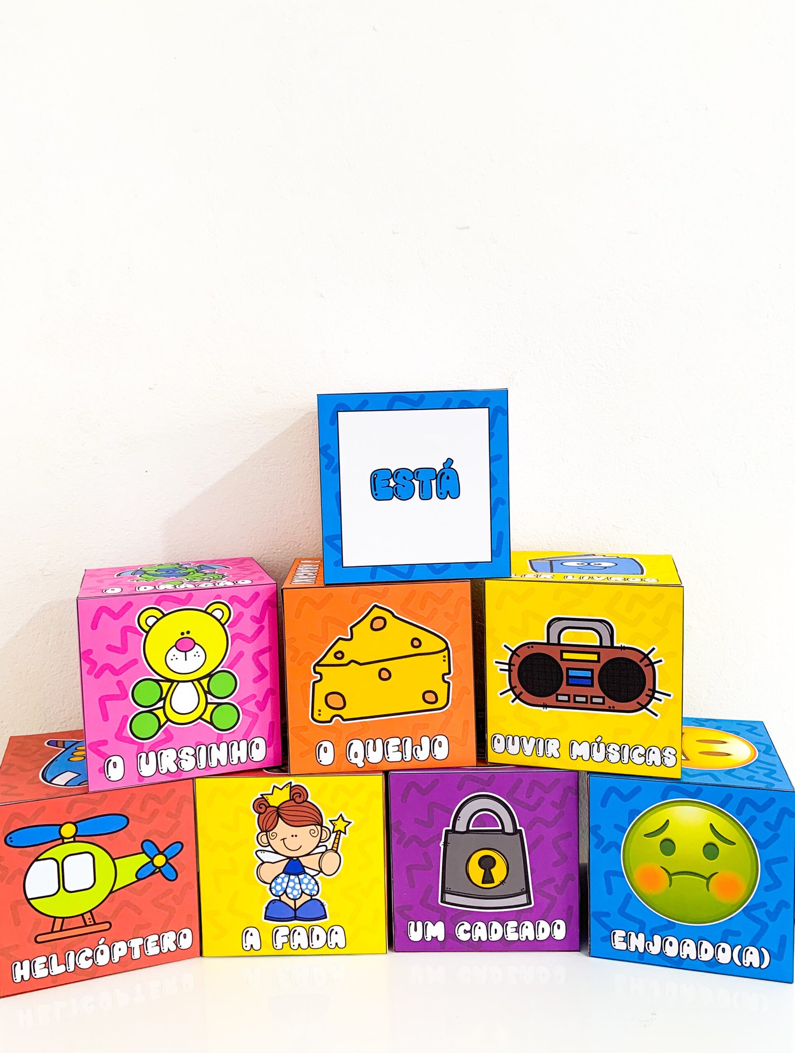 Recurso com conjunto de oito dados para trabalhar formação de frases com crianças em fase de alfabetização, sendo: 1 com personagens, 1 com ações e 6 com complementos à ação.