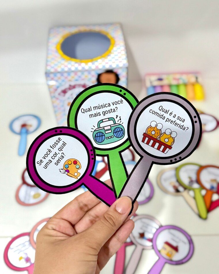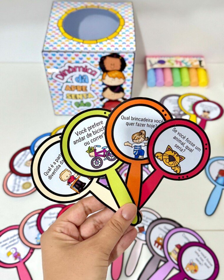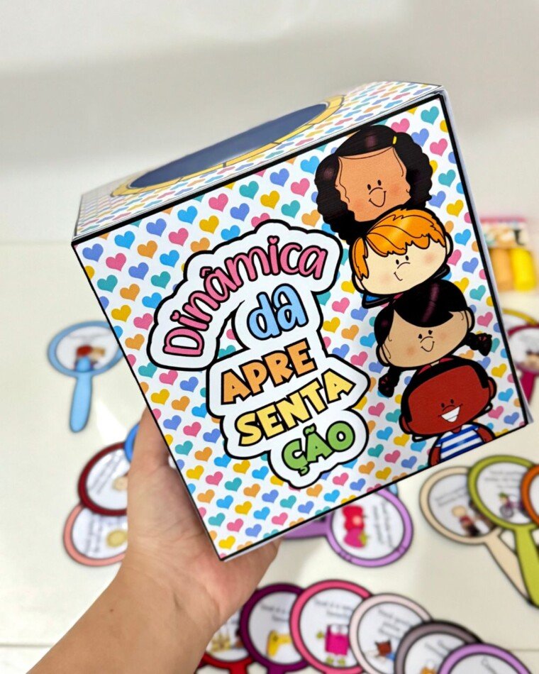 Dinâmica da Apresentação para turmas de Educação Infantil e séries iniciais do ensino Fundamental. O arquivo vai com os seguintes itens: -28 fichas ilustradas com perguntas. -Caixa para utilizar no momento da dinâmica. -Vídeo tutorial de montagem. O arquivo vai em PDF pronto para impressão.
