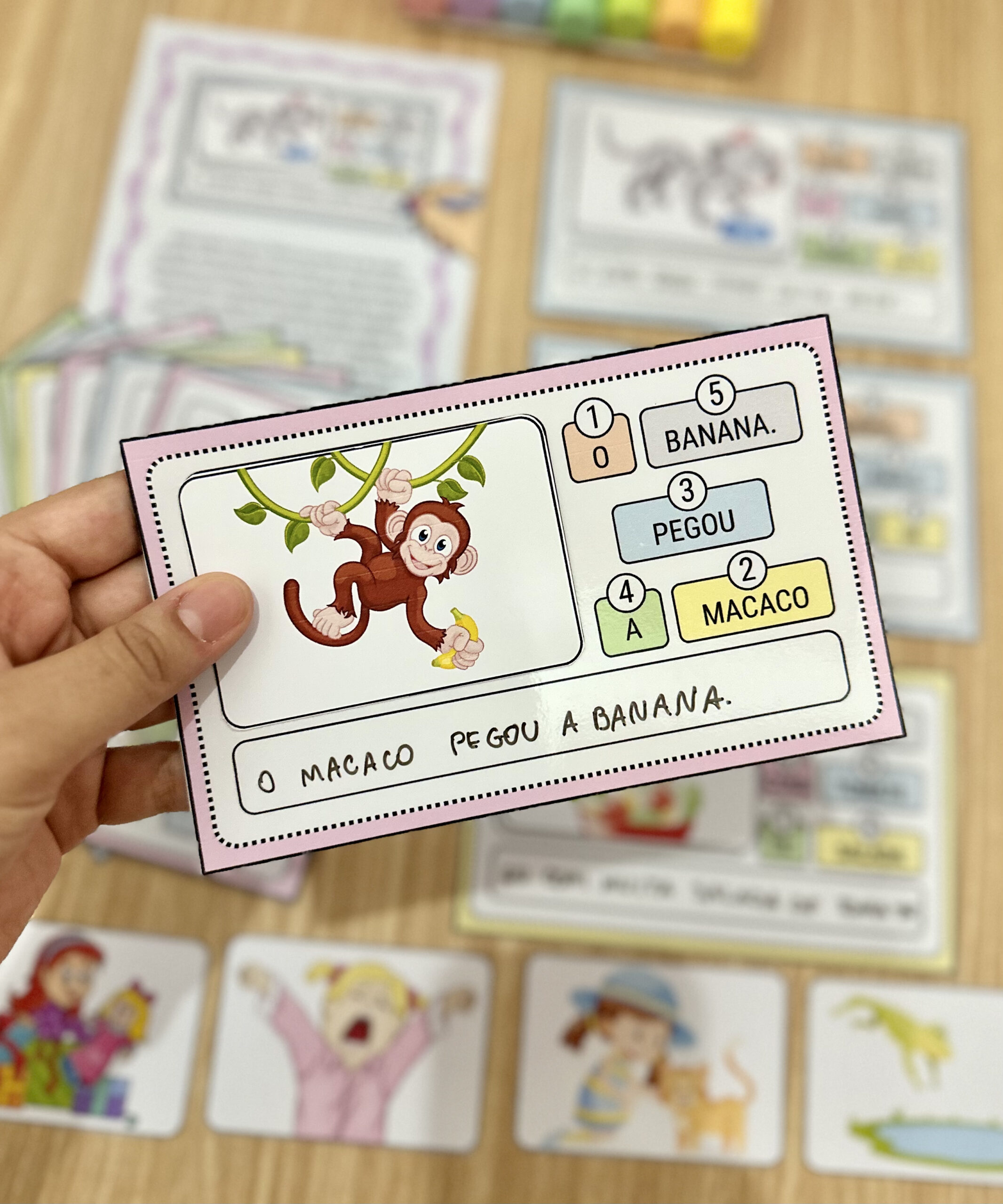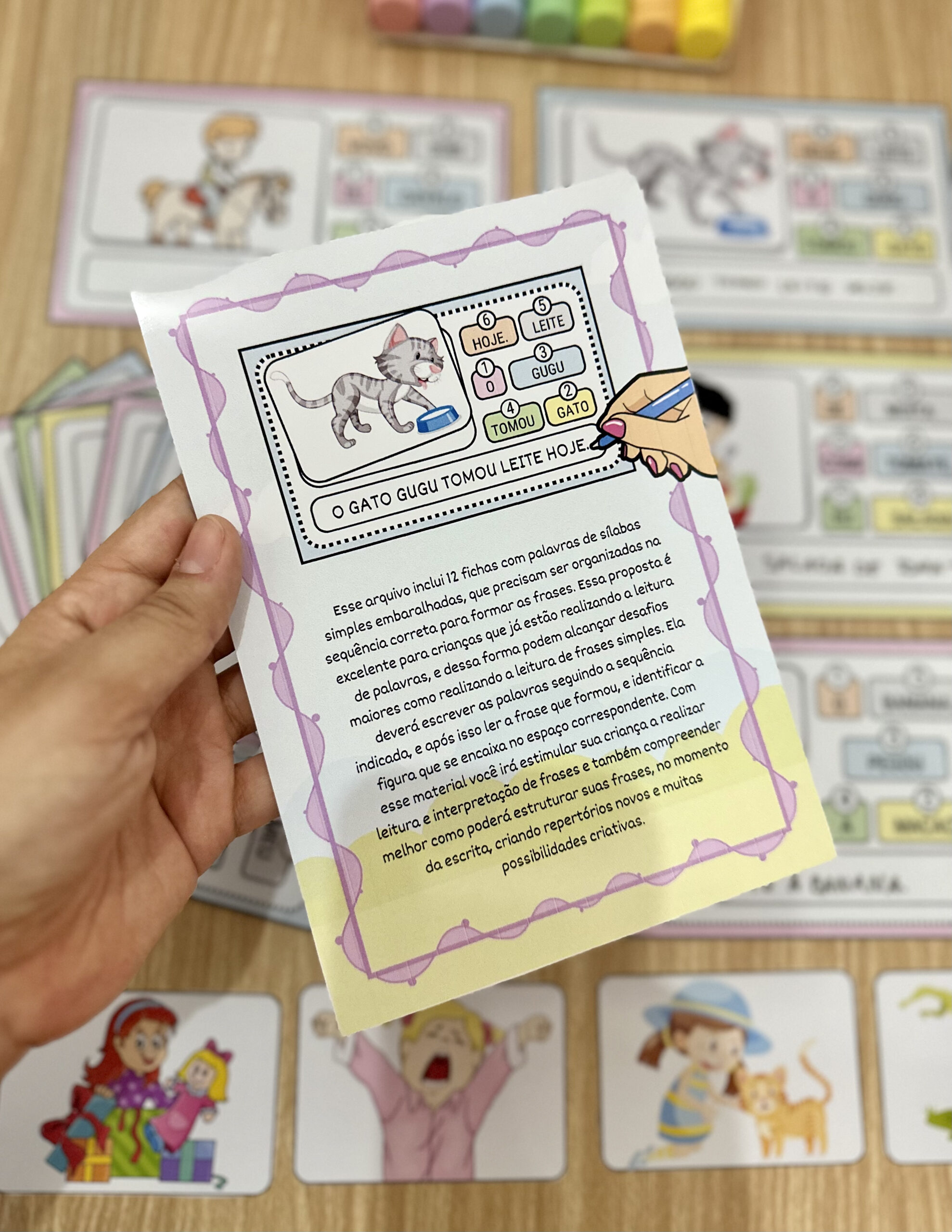 Esse arquivo inclui 12 fichas com palavras de sílabas simplesembaralhadas, que precisam ser organizadas na sequênciacorreta para formar as frases. Essa proposta é excelente paracrianças que já estão realizando a leitura de palavras, e dessaforma podem alcançar desafios maiores como realizando aleitura de frases simples.