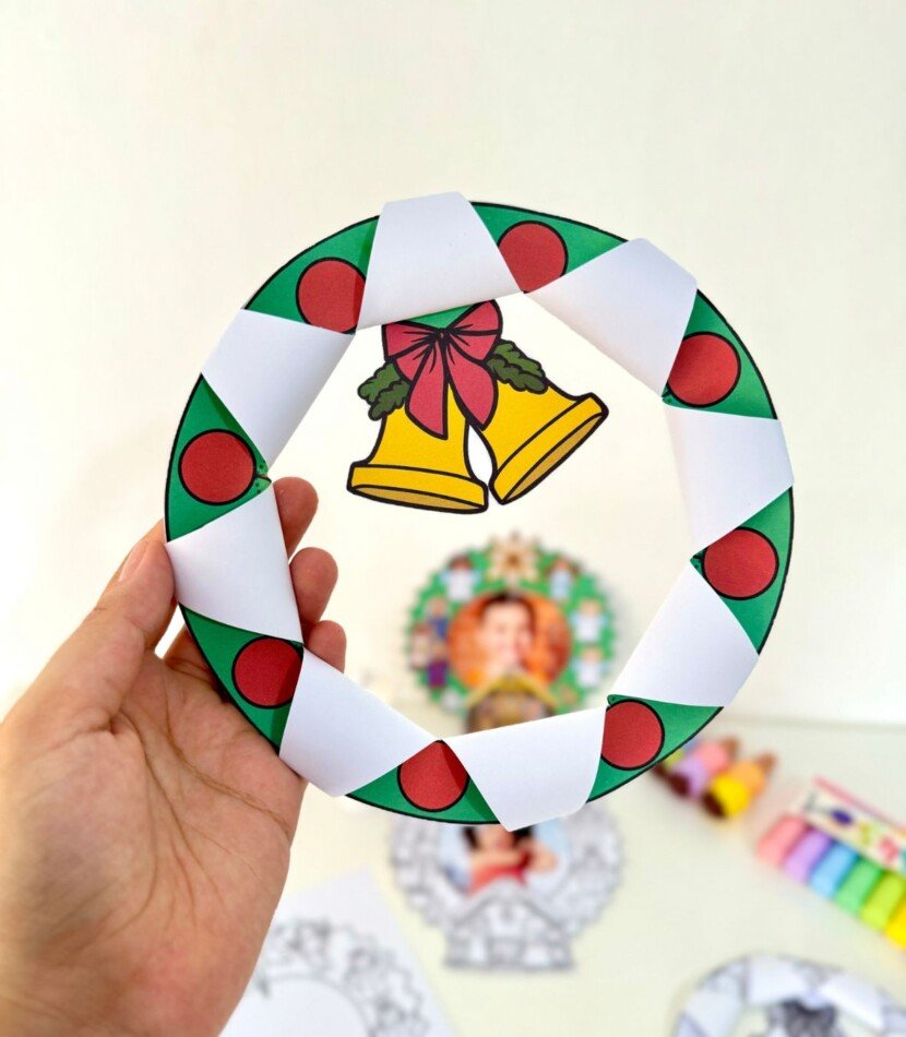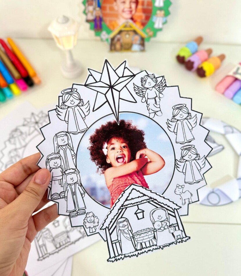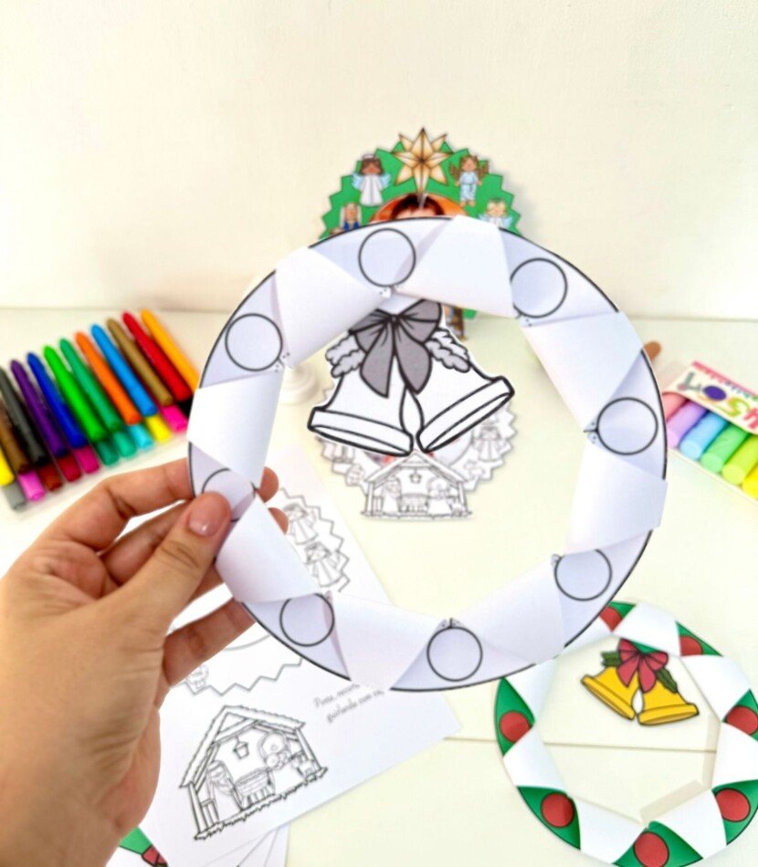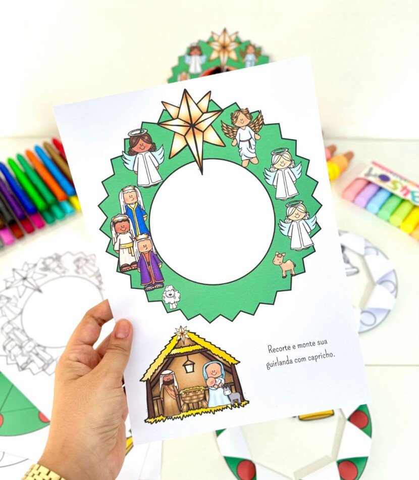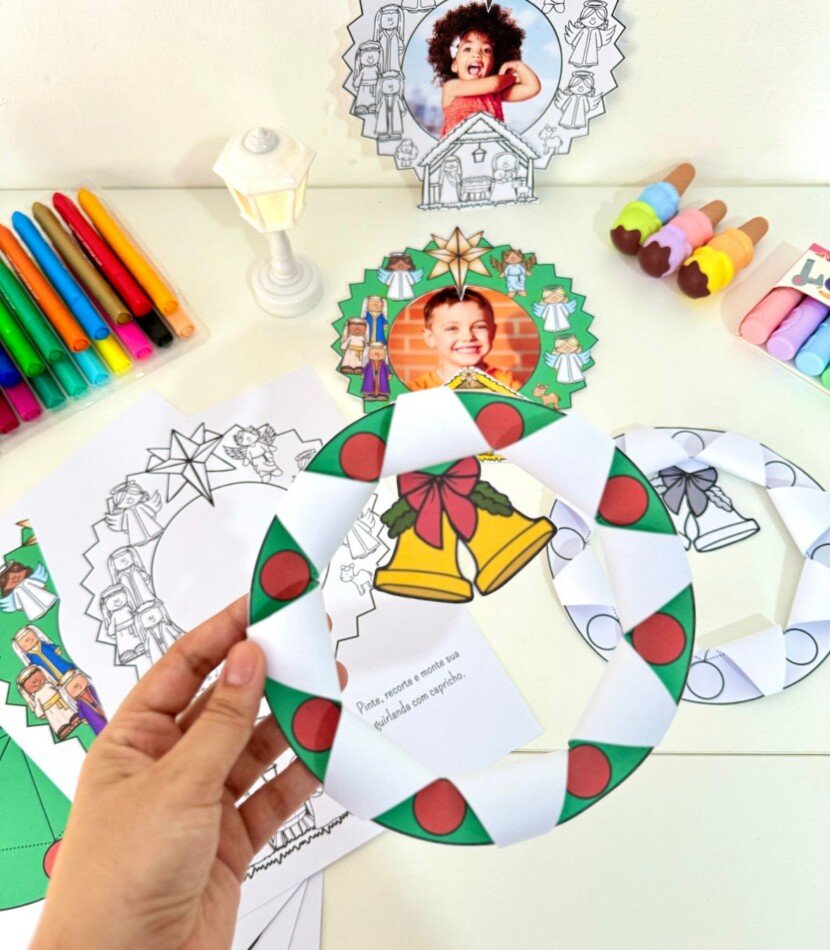 Guirlanda para recortar e colar o presépio, opção de colar foto da criança e guirlanda para recortar e montar dobradura com sinos