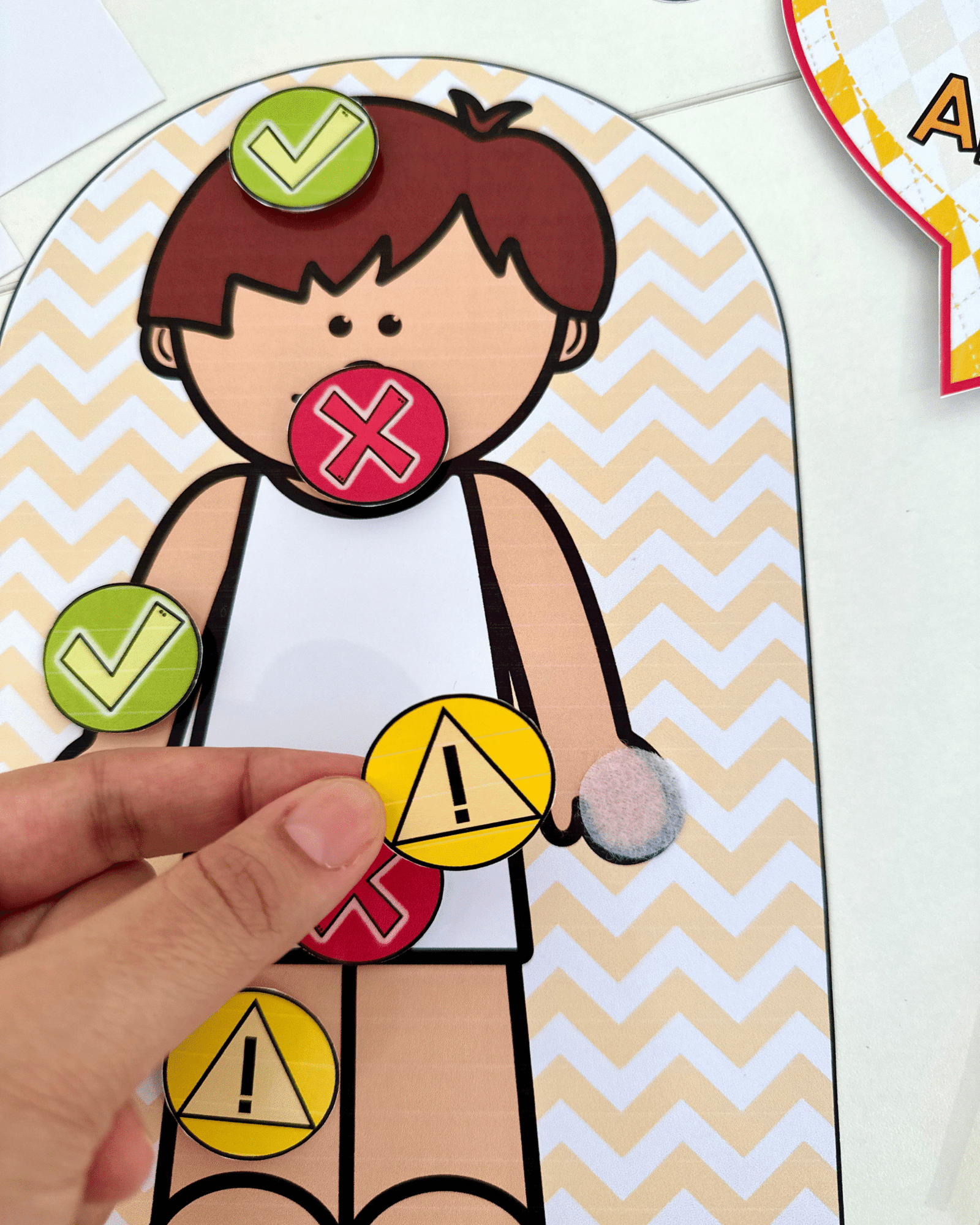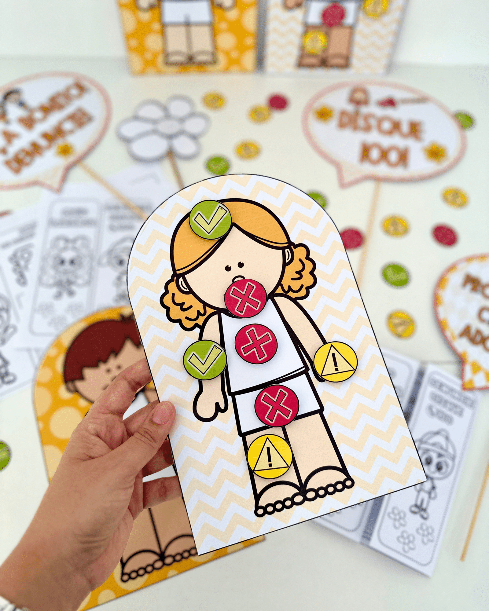✅Bolinhas para indicar as partes do corpo que podem ou não ser tocadas.