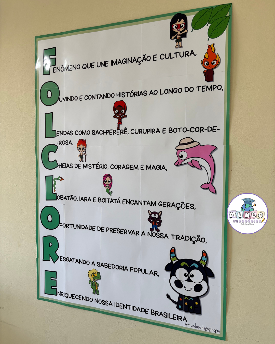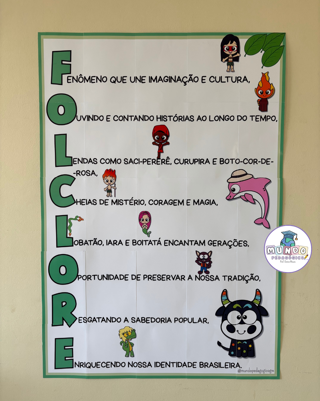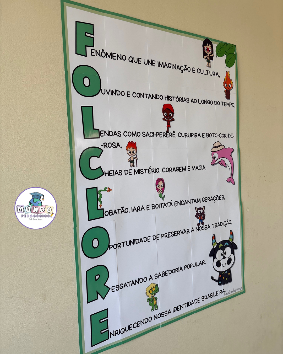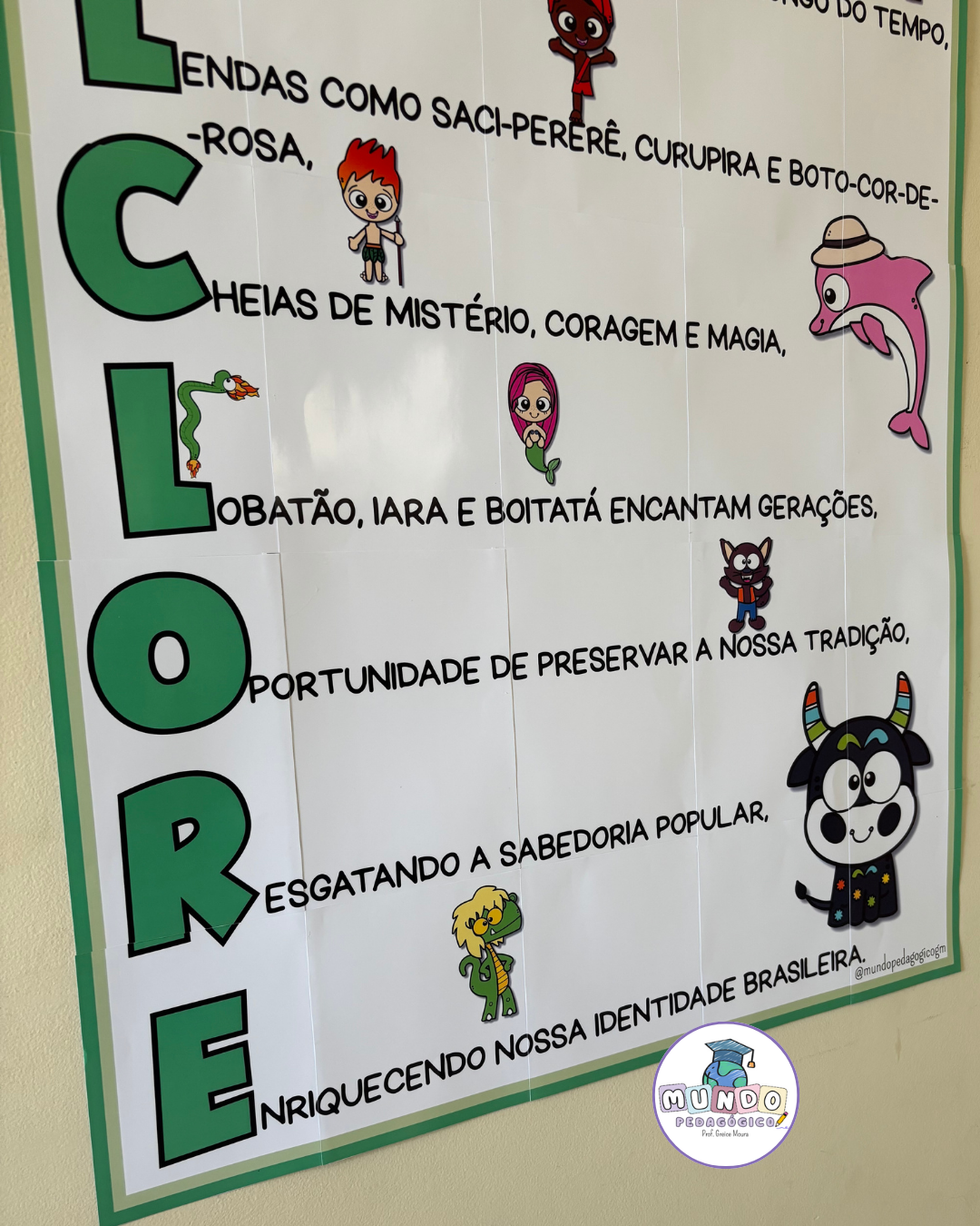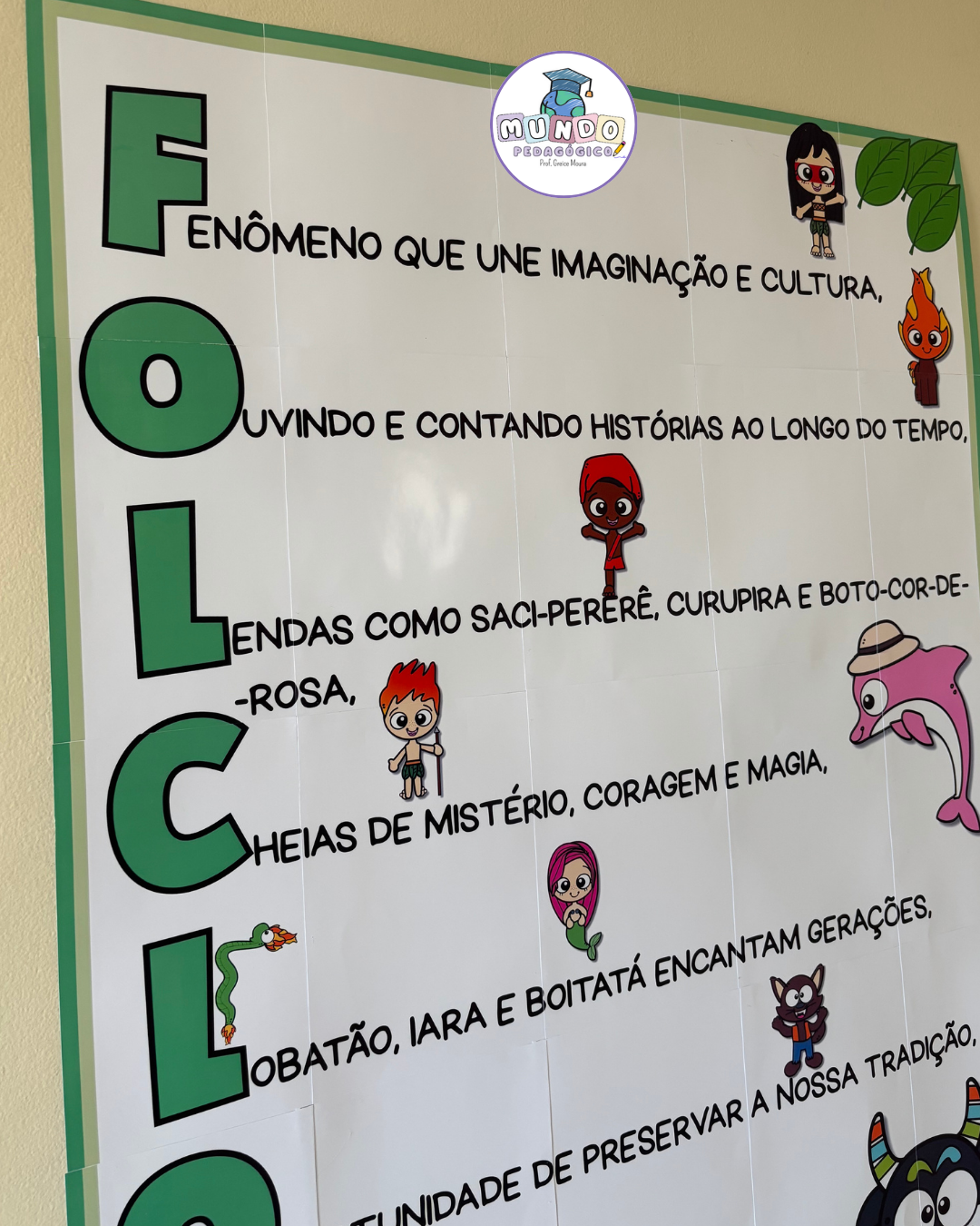 O painel apresenta um acróstico com a palavra FOLCLORE, acompanhado de frases que valorizam nossas tradições e de ilustrações divertidas dos principais personagens das lendas brasileiras