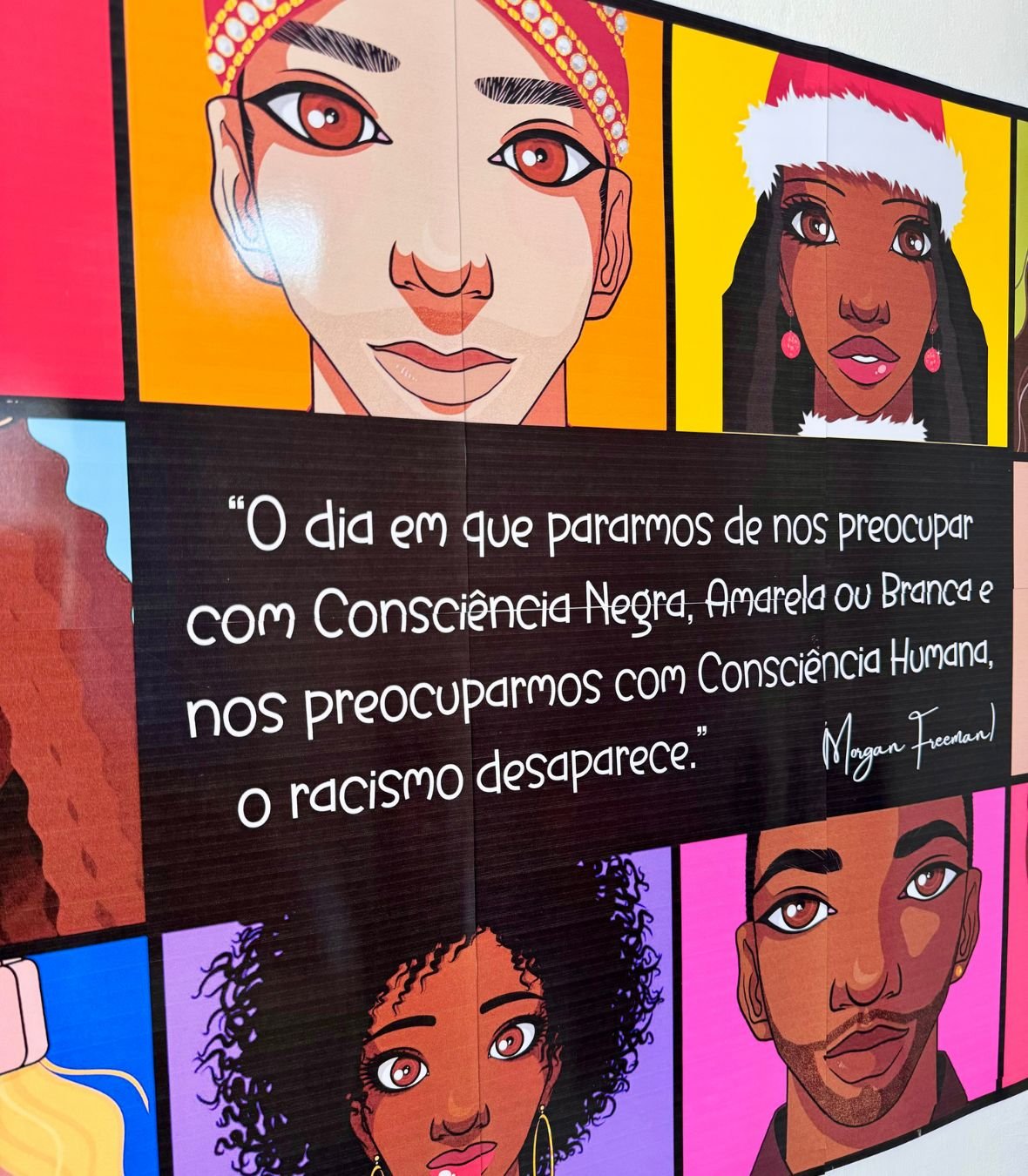 O Painel vai ampliado e pronto para impressão, com a frase “O dia em que pararmos de nos preocupar com Consciência Negra, Amarela ou Branca e nos preocuparmos com Consciência Humana, o racismo desaparece.” (Morgan Freeman)