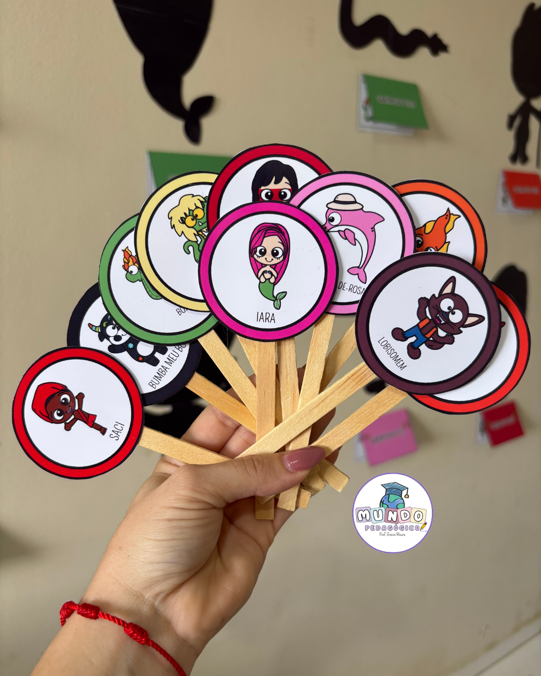 ✅10 plaquinhas com os nomes dos personagens para as crianças levantarem