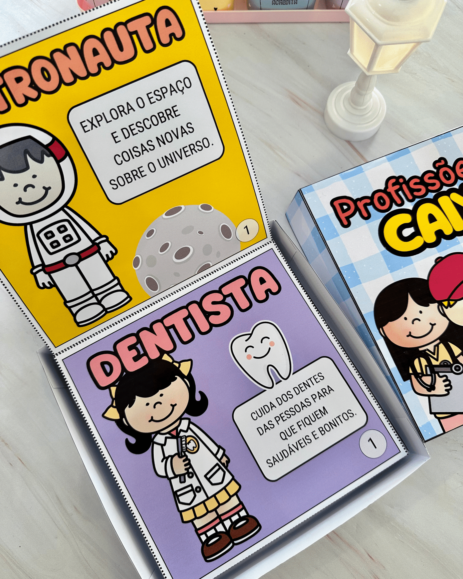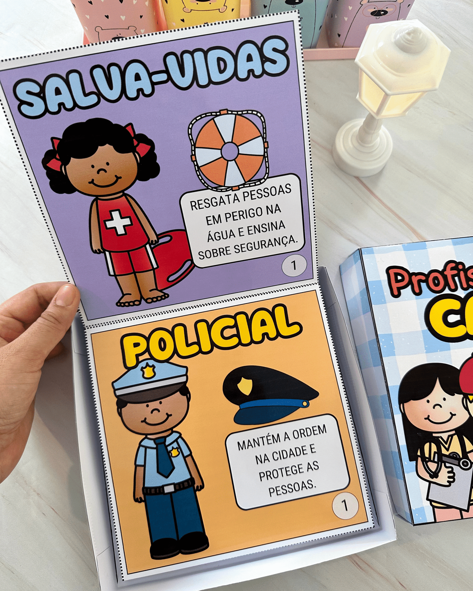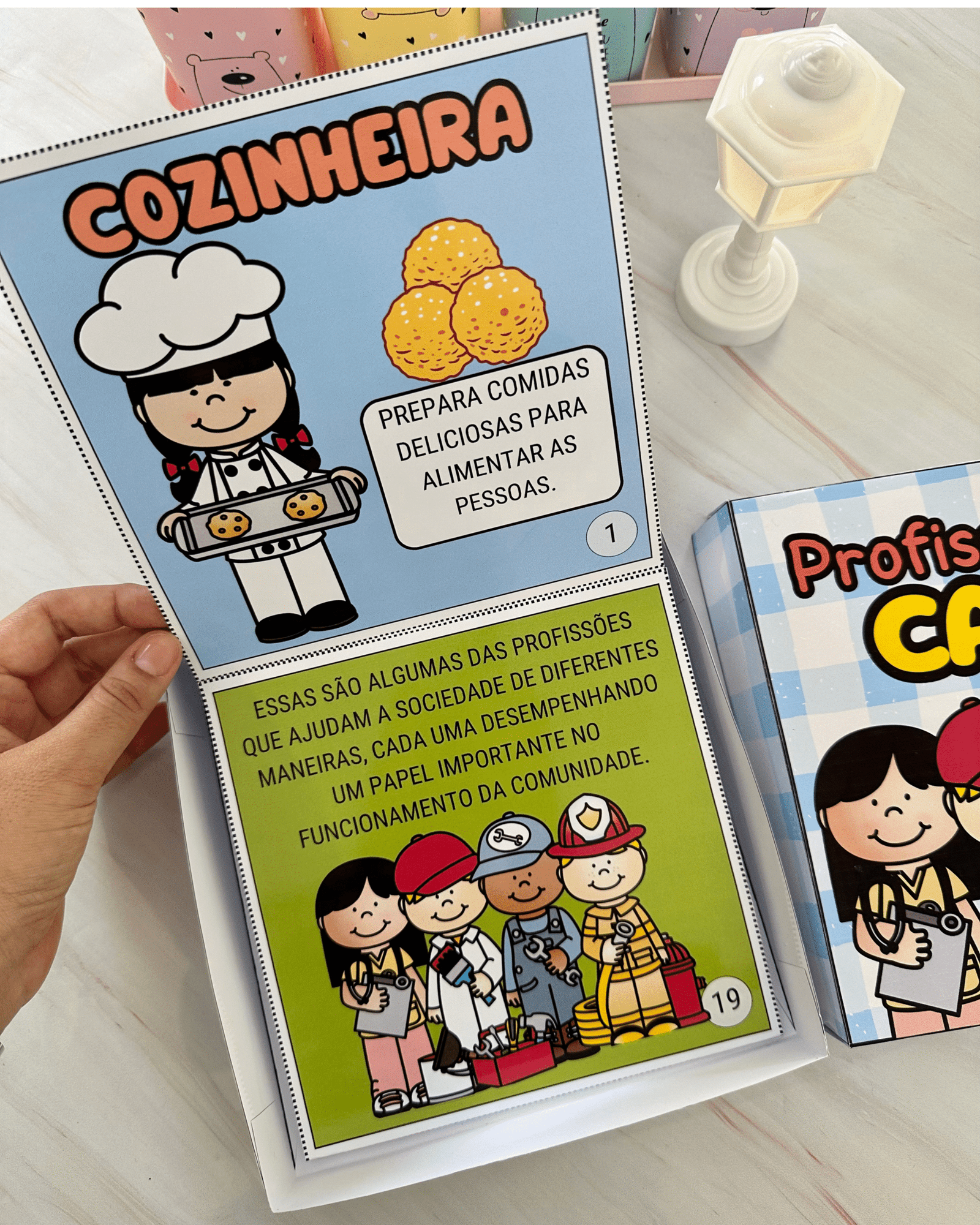 Livro Profissões na Caixa para trabalhar o tema com crianças da Educação Infantil. Esse recurso inclui diversas profissões ilustradas e descrições de como esses profissionais contribuem para a sociedade.