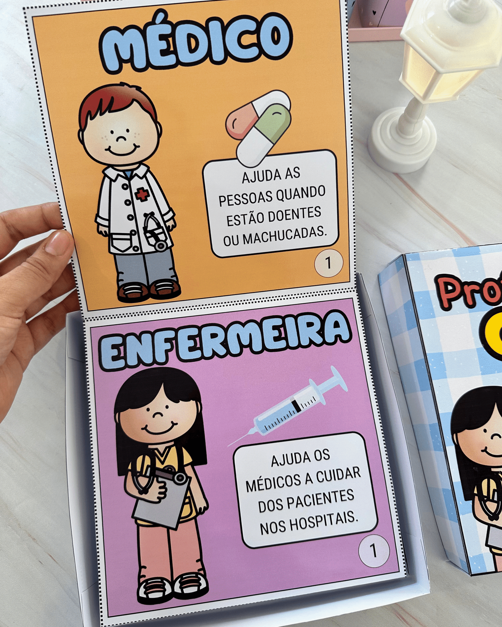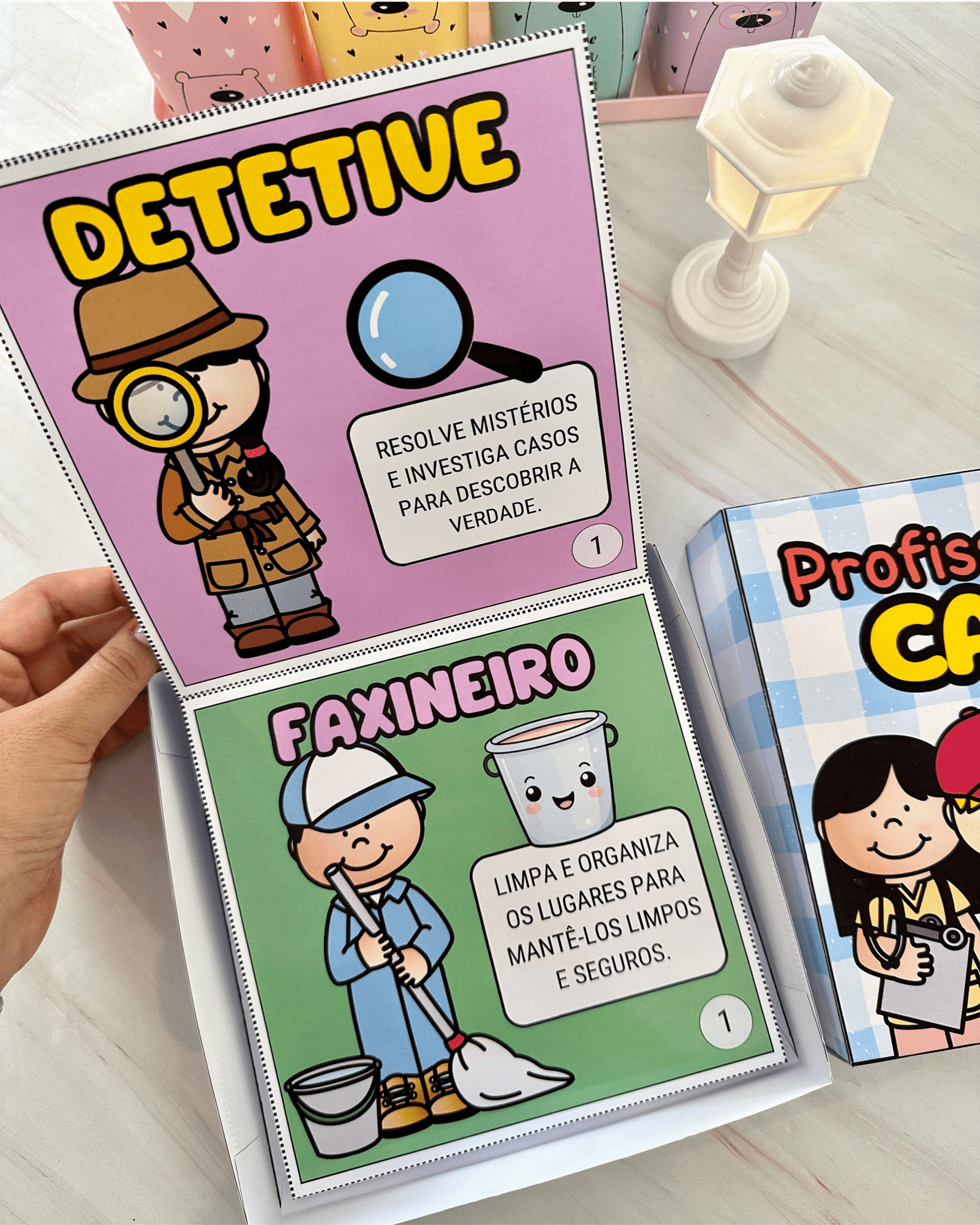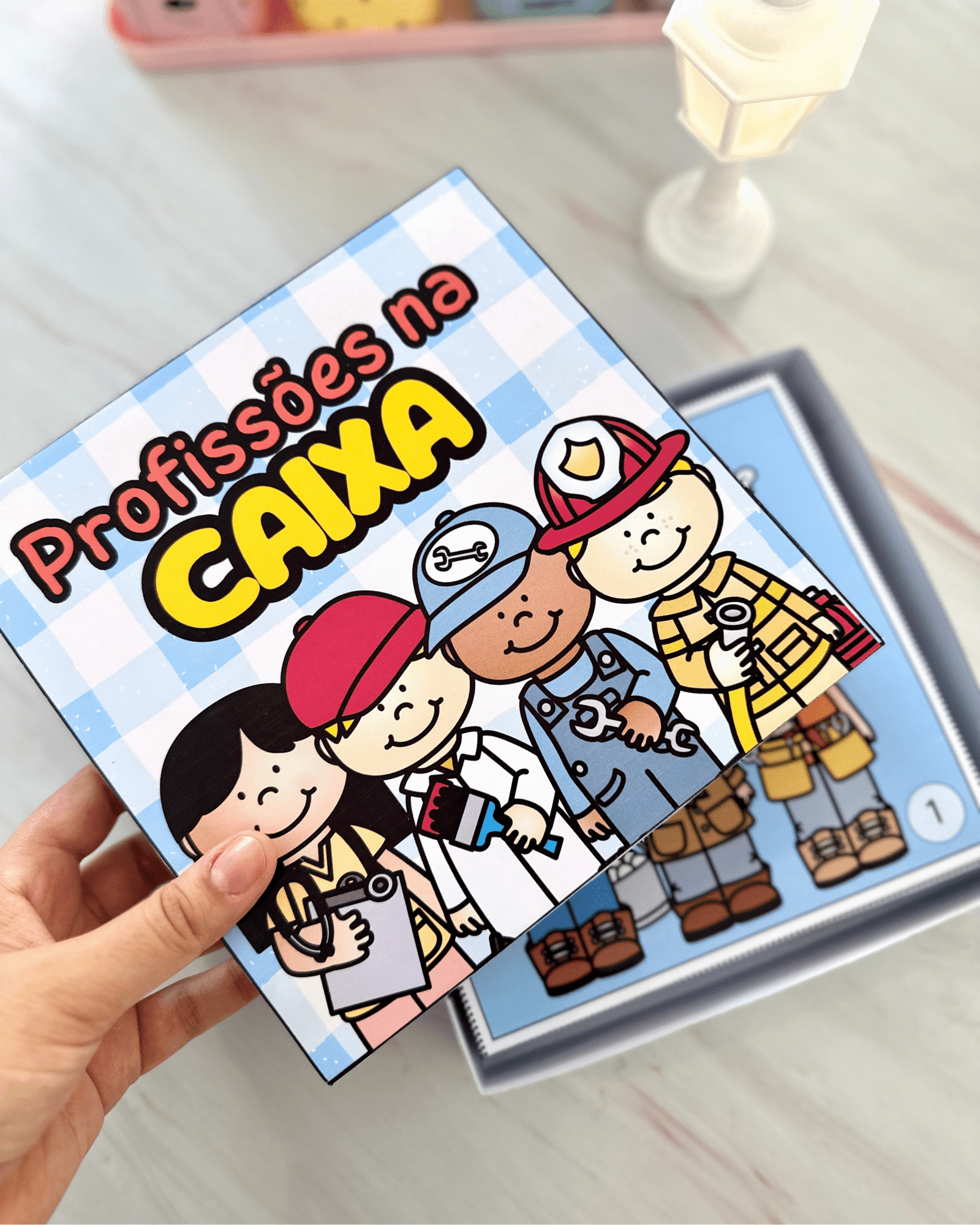 Livro Profissões na Caixa para trabalhar o tema com crianças da Educação Infantil. Esse recurso inclui diversas profissões ilustradas e descrições de como esses profissionais contribuem para a sociedade.