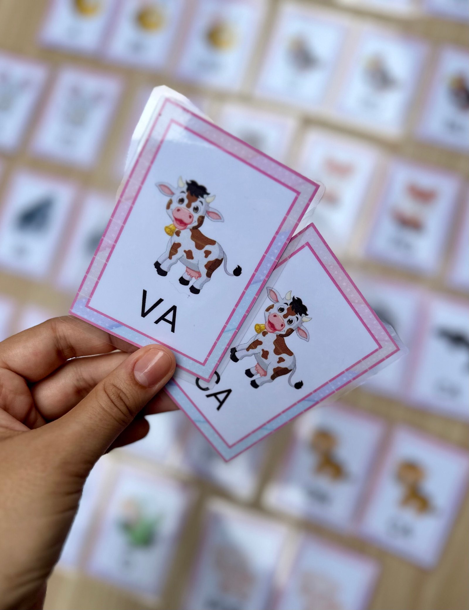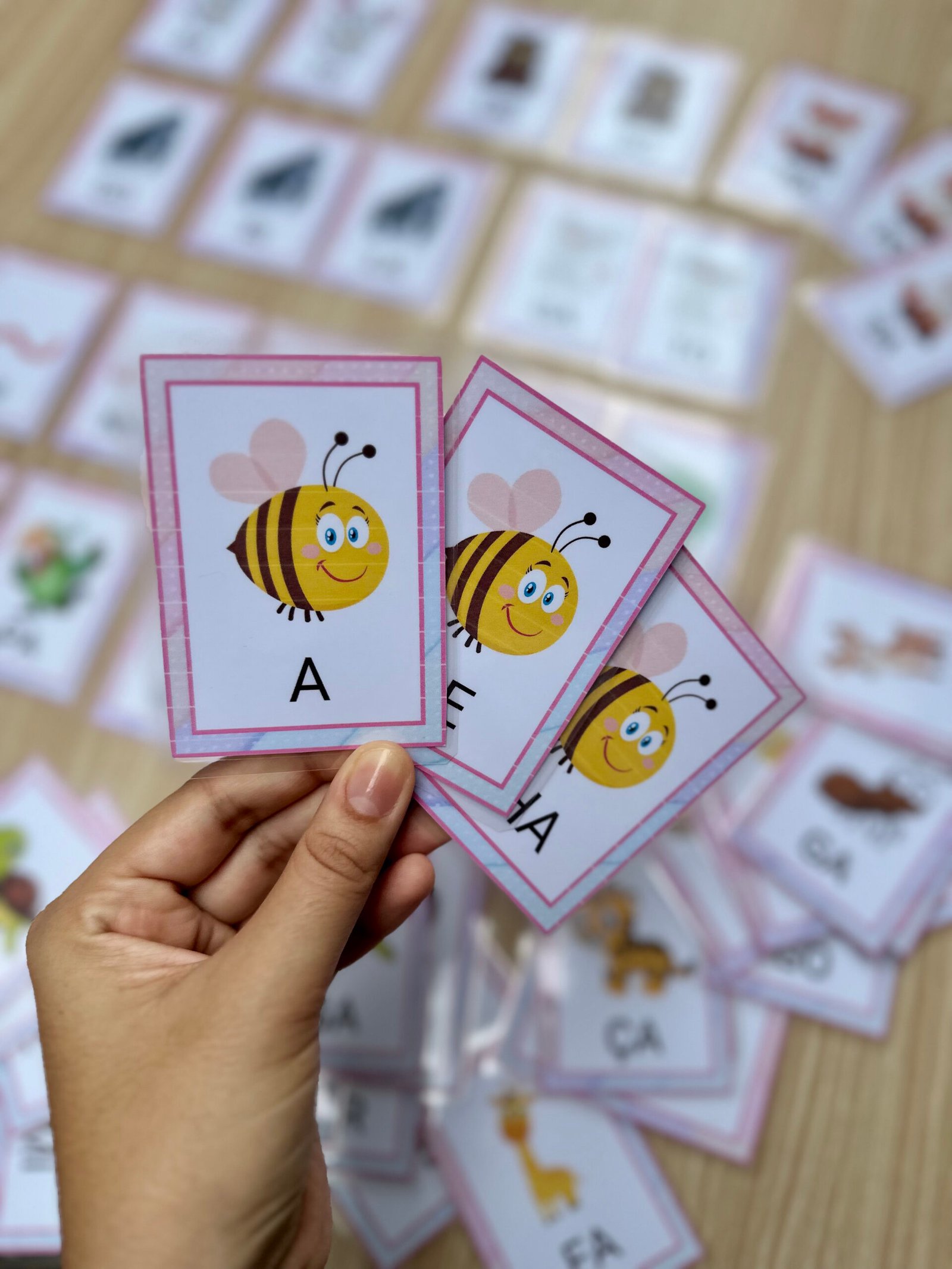 🟣Nos cartões aparece a imagem da palavra correspondente, o que facilita o processo de formação de palavras para crianças no início do processo de alfabetização. Nesse caso odesafio será ordenar as fichas,para que a palavra seja formada de forma correta.