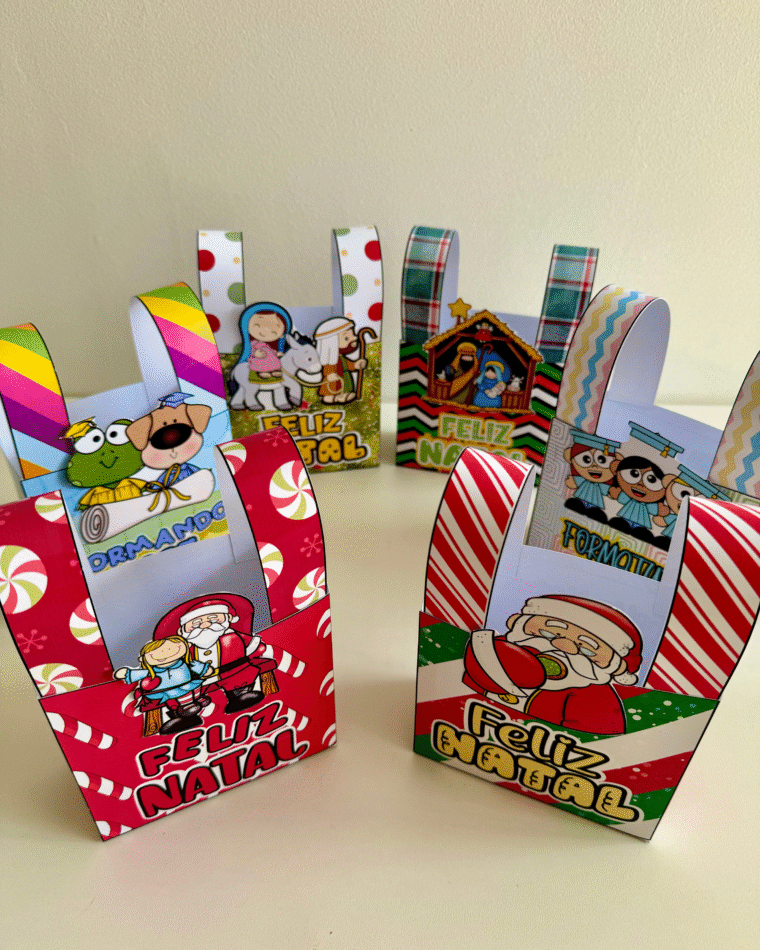 Kit de Sacolinhas Decoradas para lembrancinhas de final de ano. O material inclui os seguintes modelos: -Sacolinha tema Formatura 1 -Sacolinha tema Formatura 2 – Sacolinha tema Natal Cristão 1 – Sacolinha tema Natal Cristão 2 – Sacolinha tema Natal Papai Noel 1 – Sacolinha tema Natal Papai Noel 2