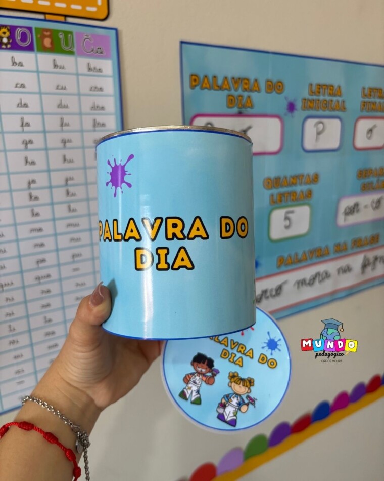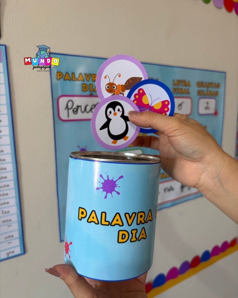 O recurso é composto por um silabário visual e por um sorteio interativo da Palavra do Dia, no qual as crianças retiram imagens do recipiente e, a partir delas, constroem palavras, identificam sílabas, contam letras e exploram sons iniciais e finais.