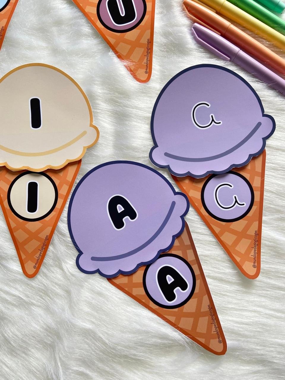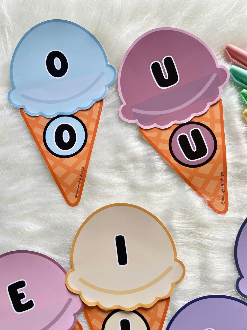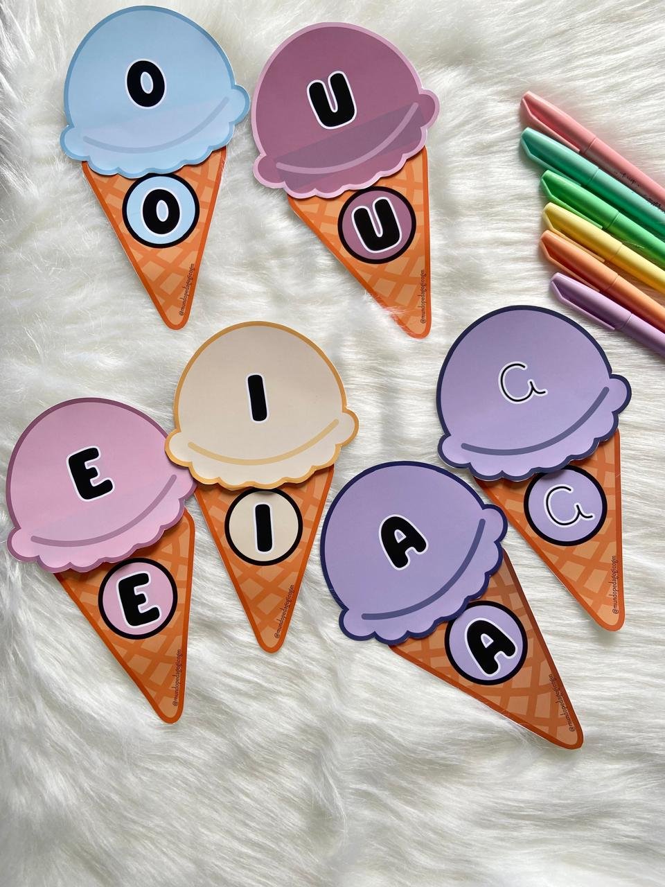 Este material consiste em uma coleção de sorvetes ilustrados, cada um representando uma das vogais (A, E, I, O, U).