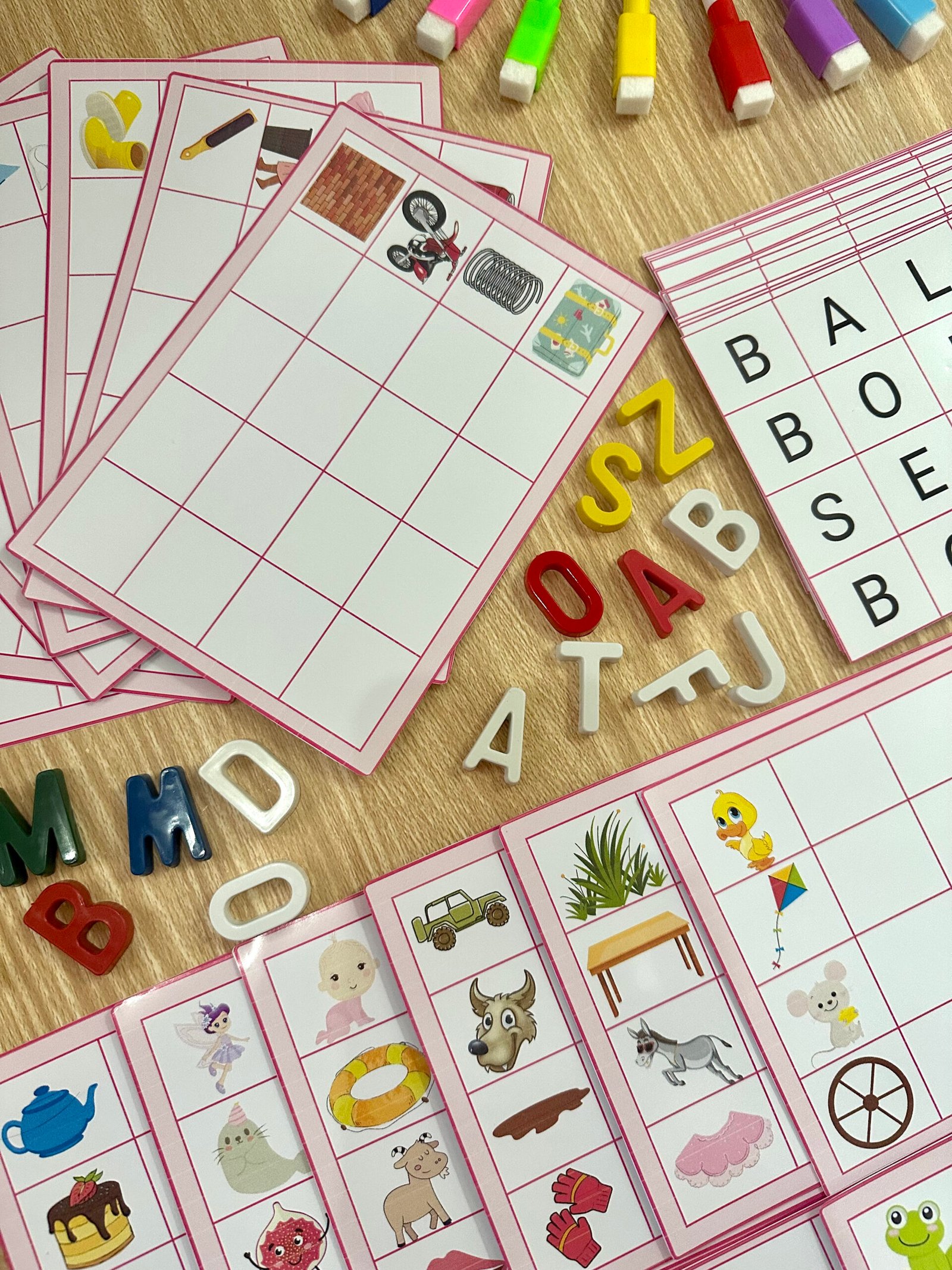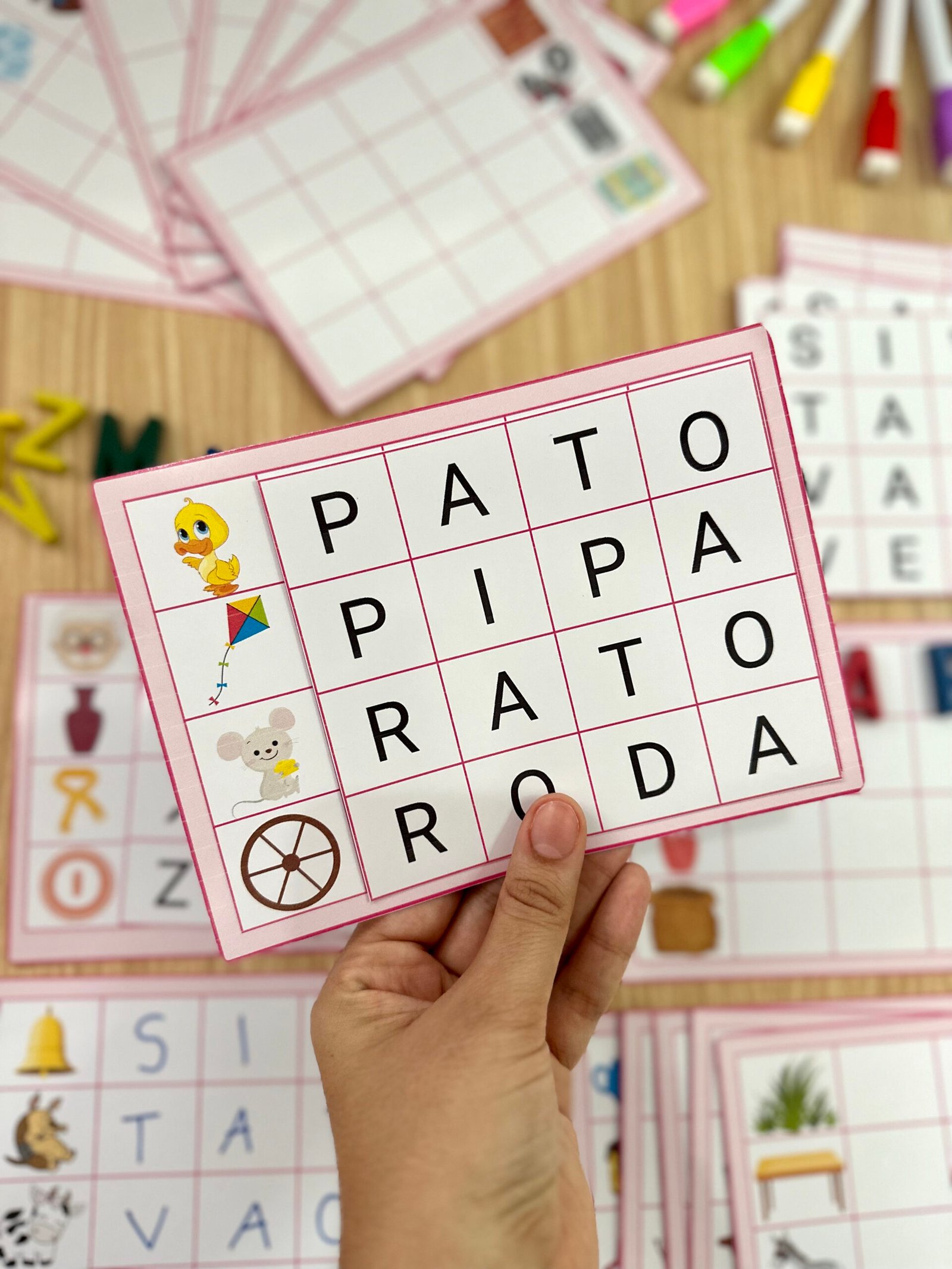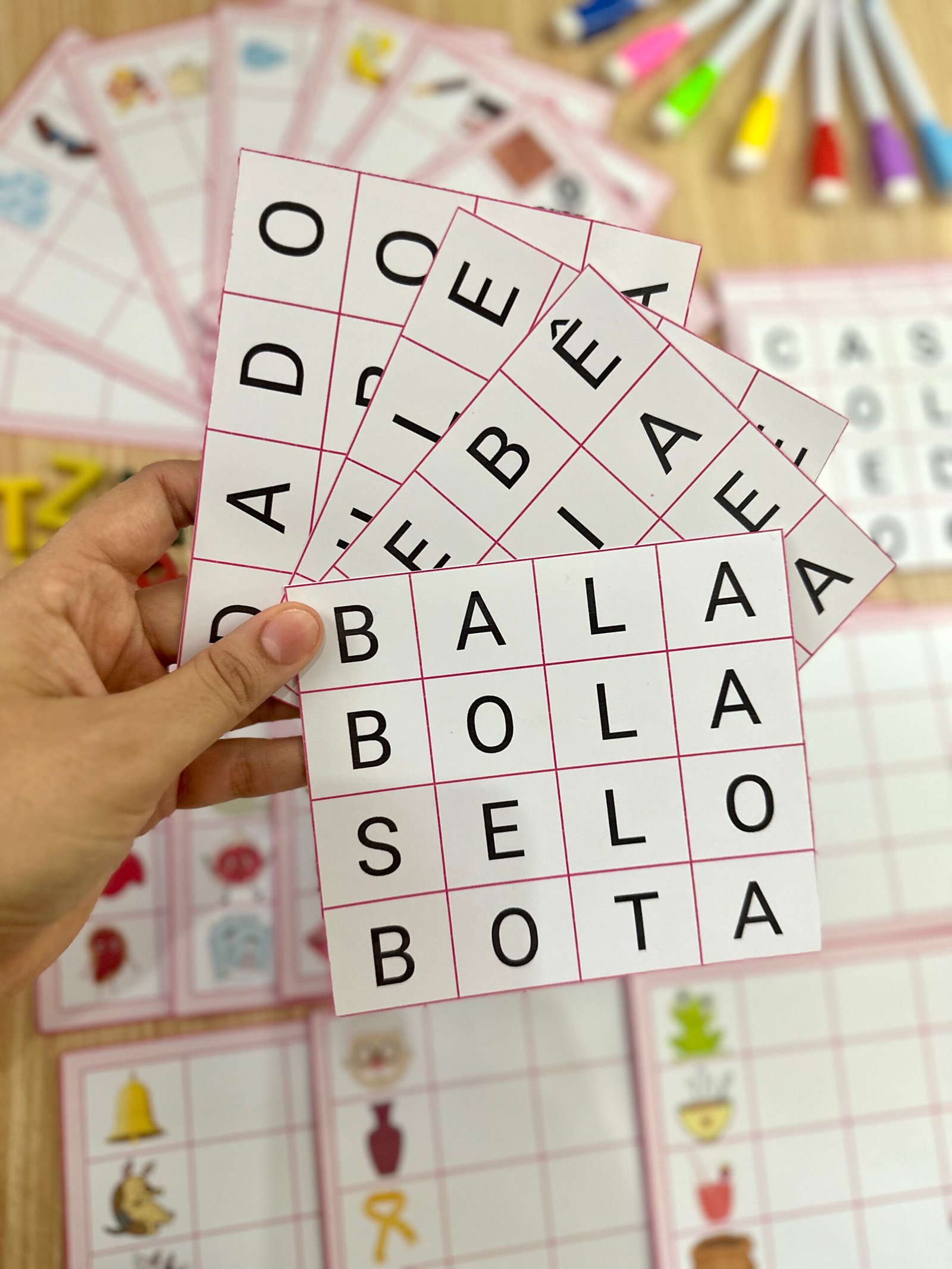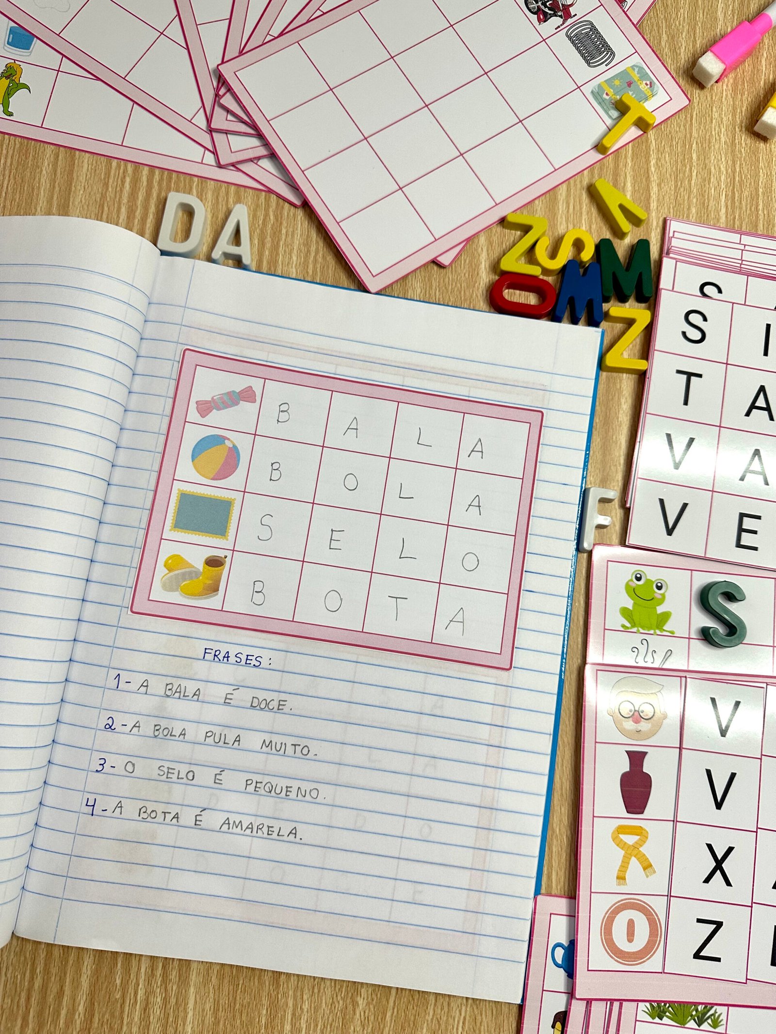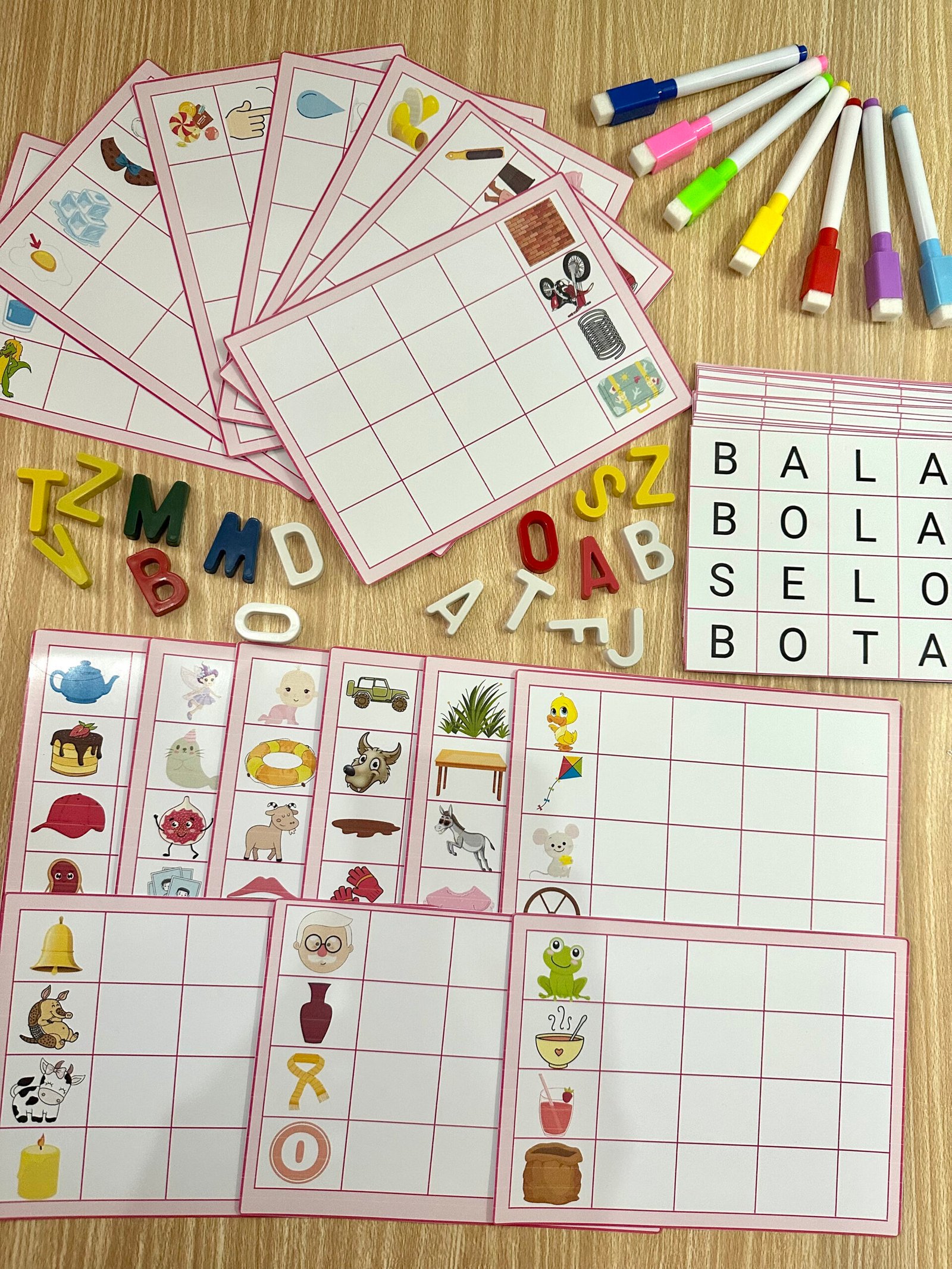 canetas para quadro branco (nesse caso é necessário utilizar papel contact na ficha), pode ser utilizado como atividade no caderno e também com letras móveis comuns em salas de