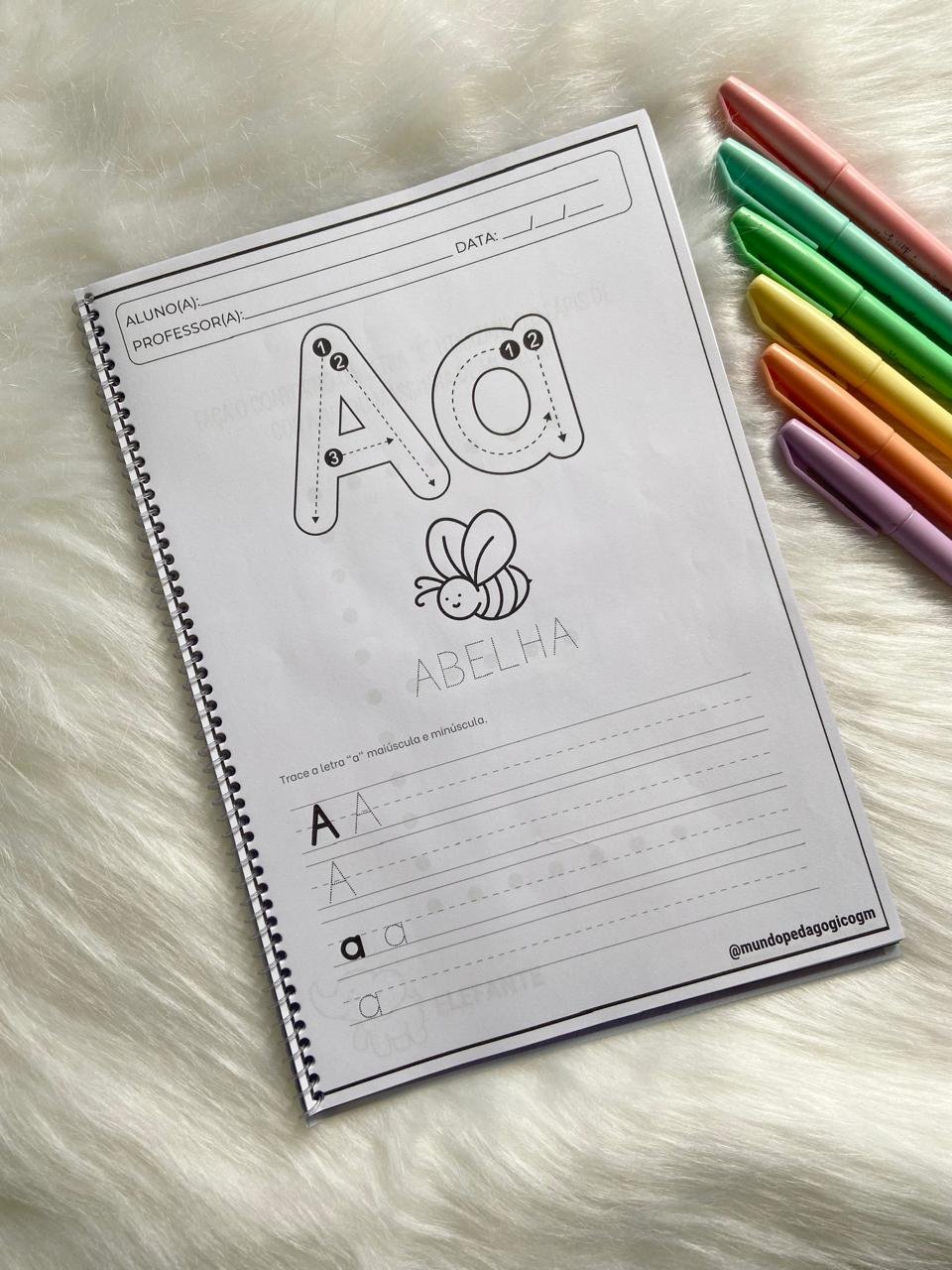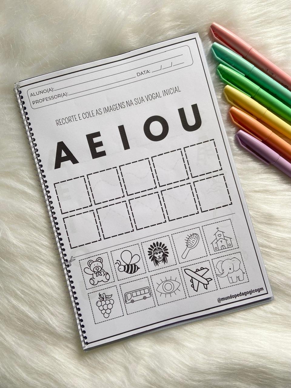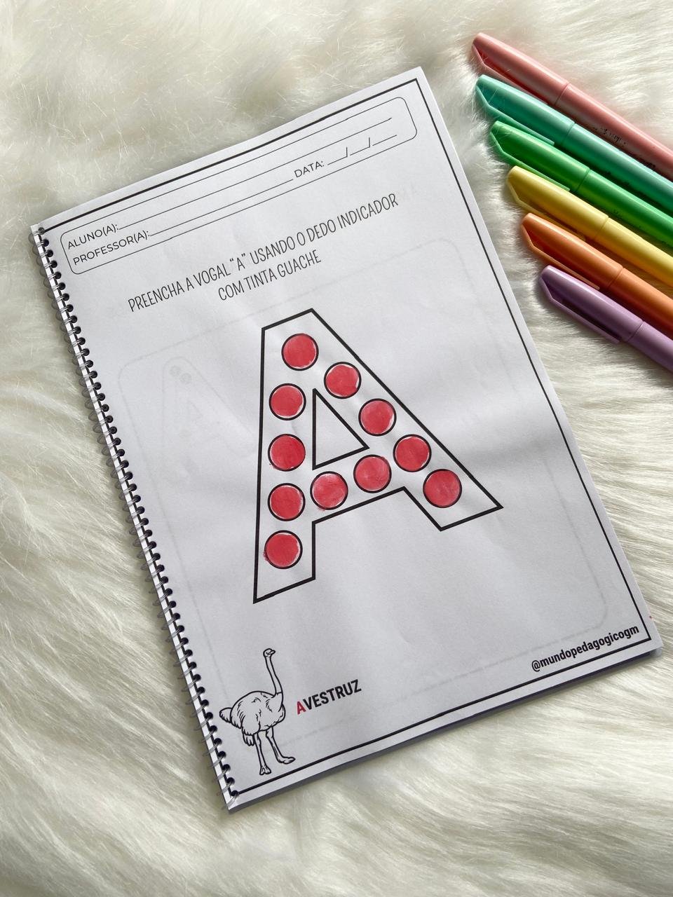 A apostila possui 31 páginas de atividades envolvendo todas as vogais, a criança aprende os movimentos corretos do traçado de cada letra. O traçado da letra recruta habilidades sensoriais, noções de orientação espacial, ajuda a criança a “treinar” a mão para a execução dos movimentos corretos, desenvolvendo também a coordenação motora fina.